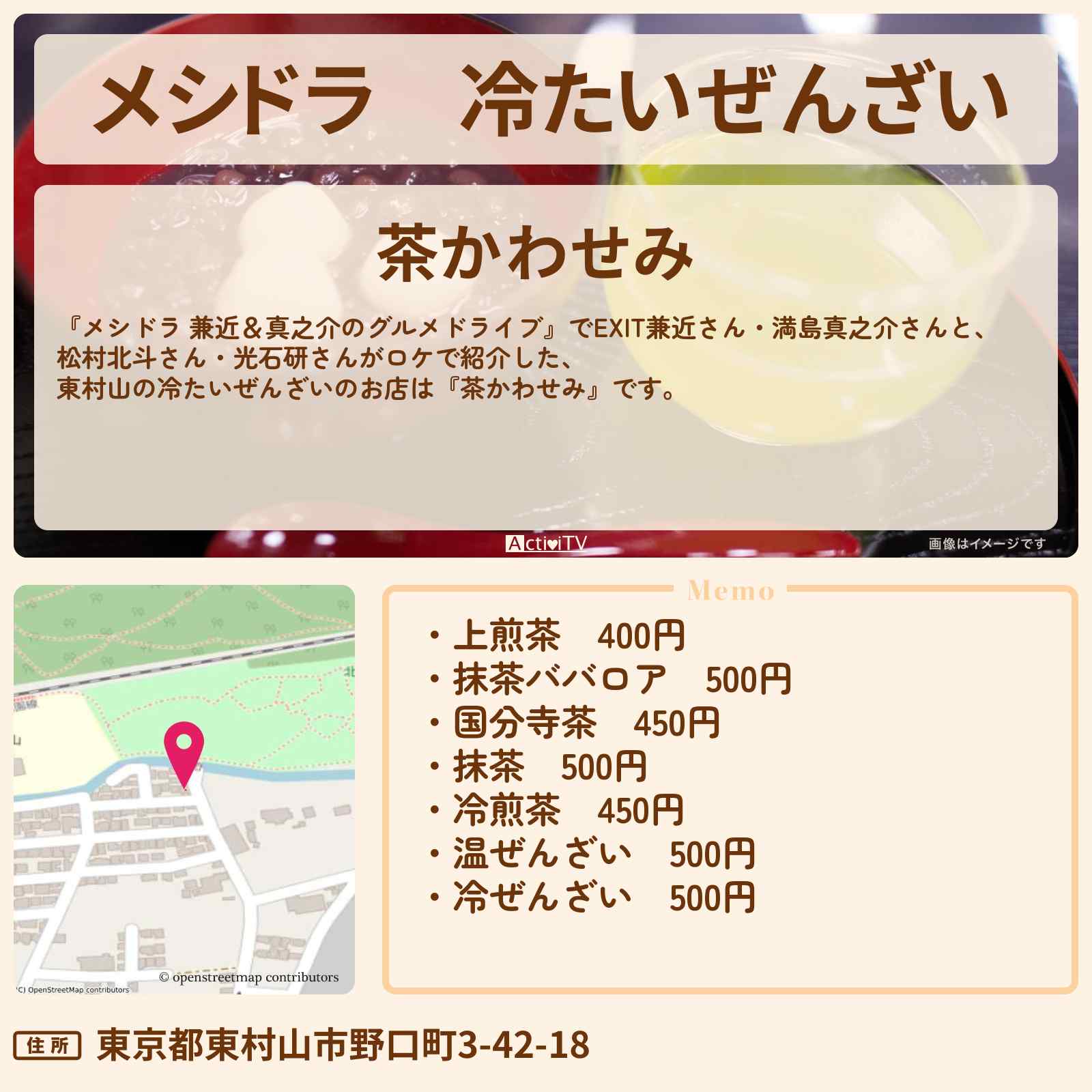 放送の【メシドラ 兼近&真之介のグルメドライブ】でEXIT兼近さん・満島真之介さんと、松村北斗さん・光石研さんがロケで紹介した、東村山の冷たいぜんざいのお店は『茶かわせみ』です。