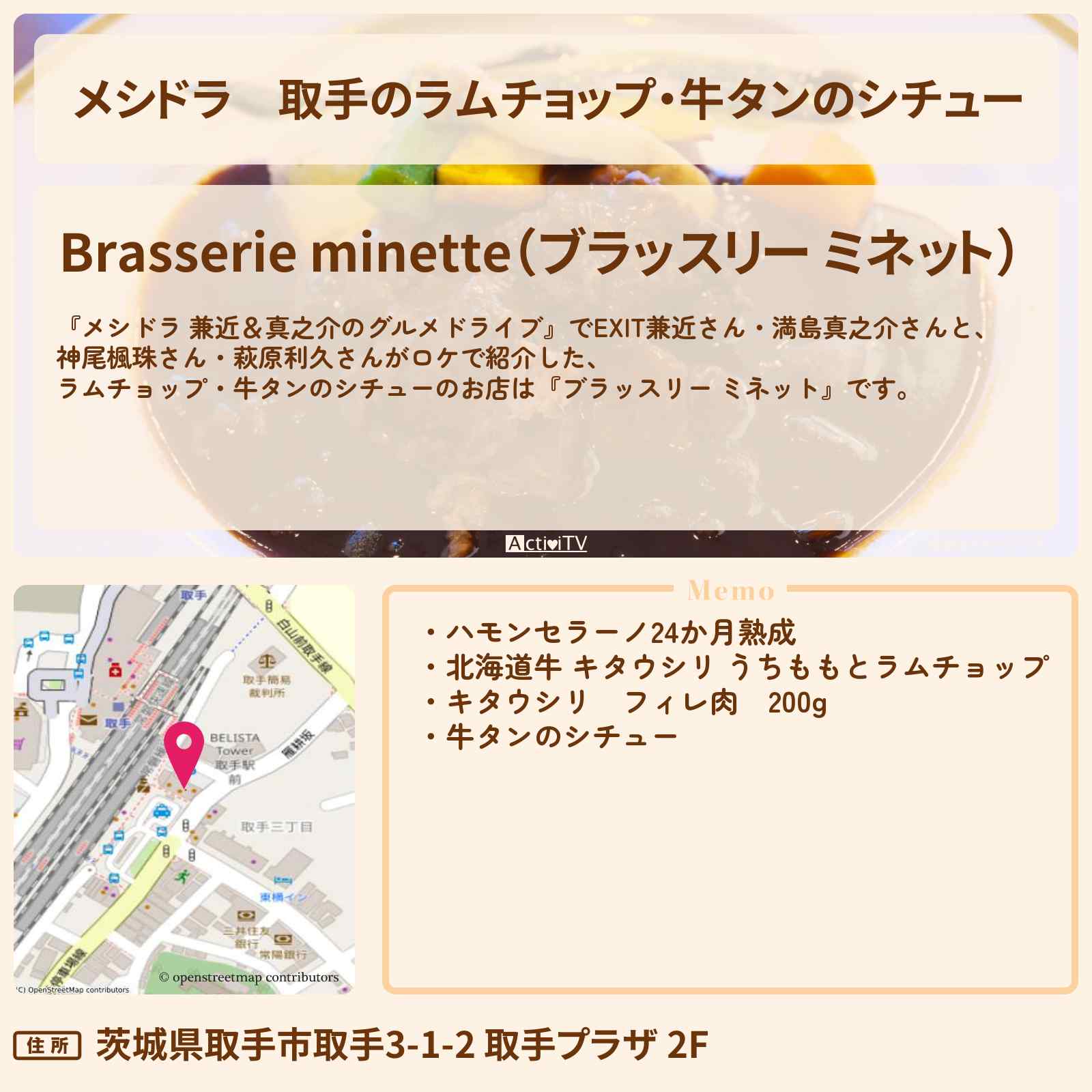 放送の【メシドラ 兼近&真之介のグルメドライブ】でEXIT兼近さん・満島真之介さんと、神尾楓珠さん・萩原利久さんがロケで紹介した、ラムチョップ・牛タンのシチューのお店は『ブラッスリー ミネット』です。