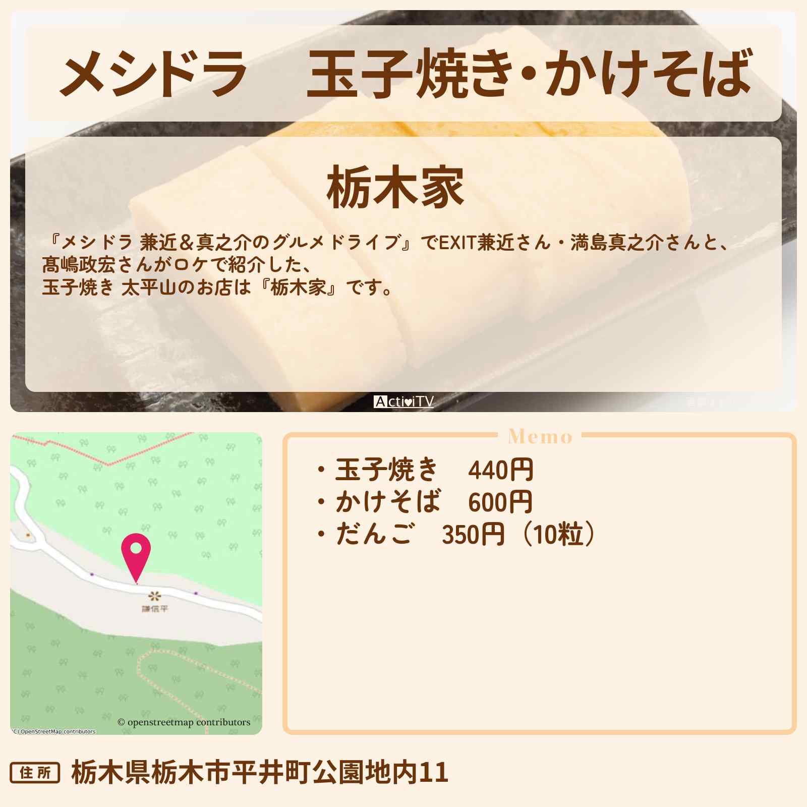 放送の【メシドラ 兼近&真之介のグルメドライブ】でEXIT兼近さん・満島真之介さんと、髙嶋政宏さんがロケで紹介した、玉子焼き 太平山のお店は『栃木家』です。