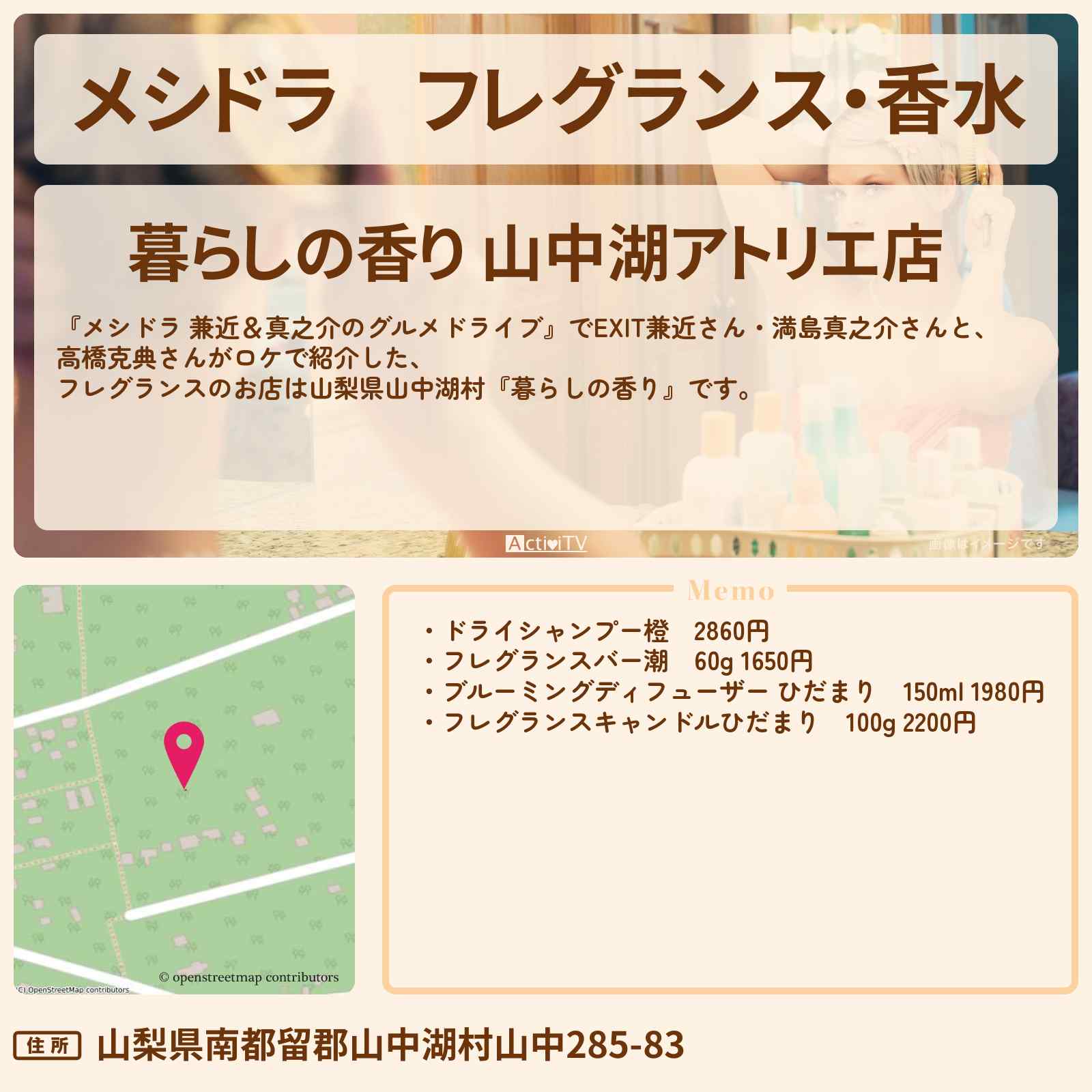 放送の【メシドラ 兼近&真之介のグルメドライブ】でEXIT兼近さん・満島真之介さんと、高橋克典さんがロケで紹介した、フレグランスのお店は山梨県山中湖村『暮らしの香り』です。