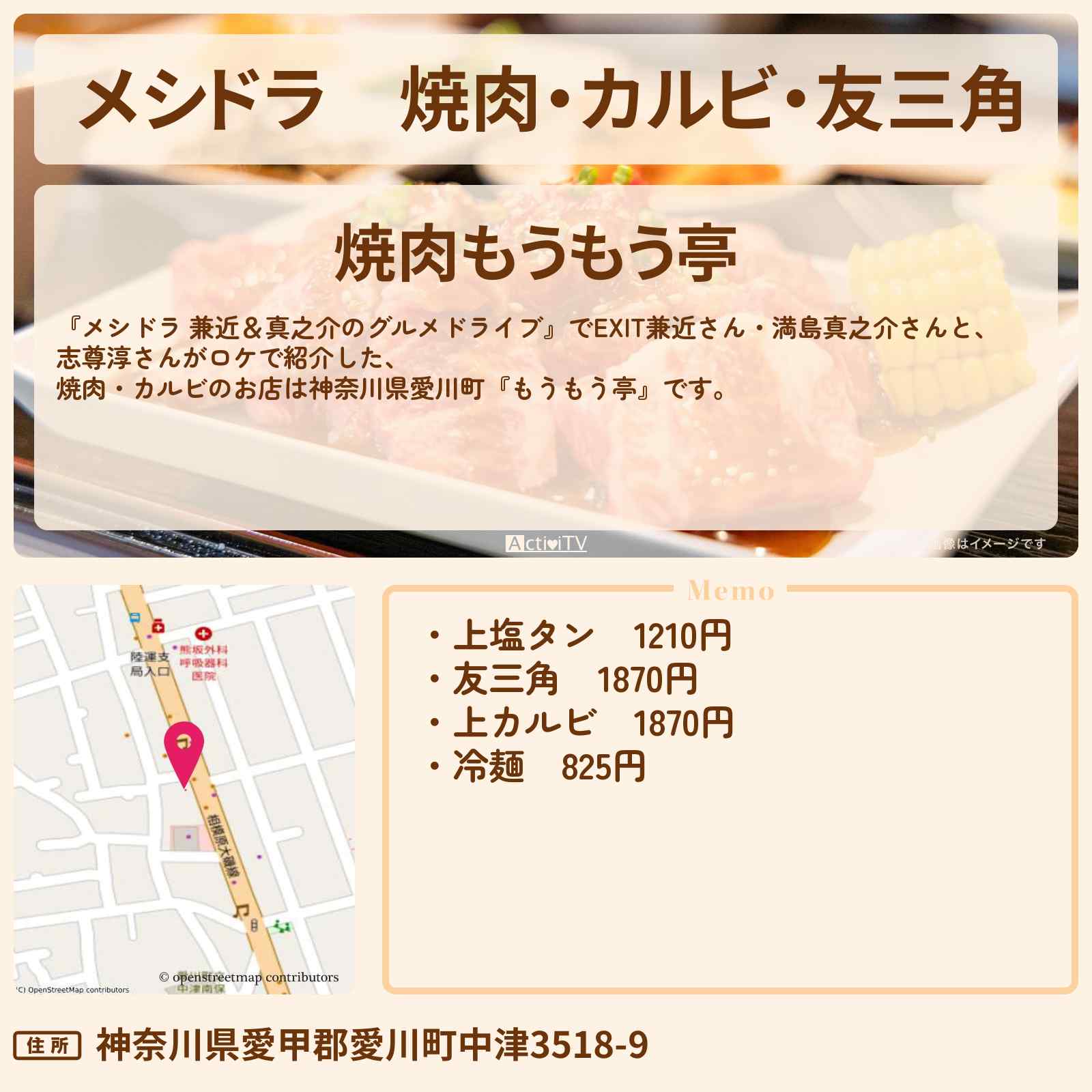 放送の【メシドラ 兼近&真之介のグルメドライブ】でEXIT兼近さん・満島真之介さんと、志尊淳さんがロケで紹介した、焼肉・カルビのお店は神奈川県愛川町『もうもう亭』です。