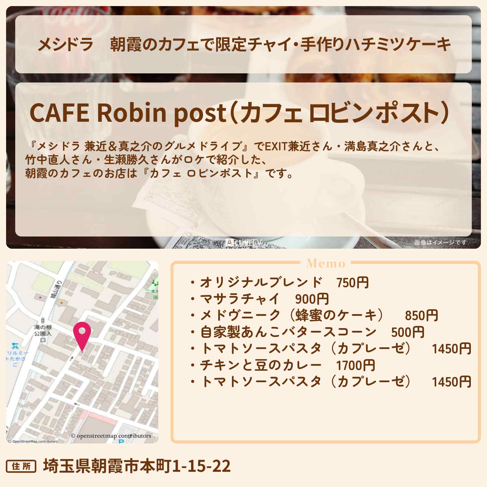 放送の【メシドラ 兼近&真之介のグルメドライブ】でEXIT兼近さん・満島真之介さんと、竹中直人さん・生瀬勝久さんがロケで紹介した、朝霞のカフェのお店は『カフェ ロビンポスト』です。