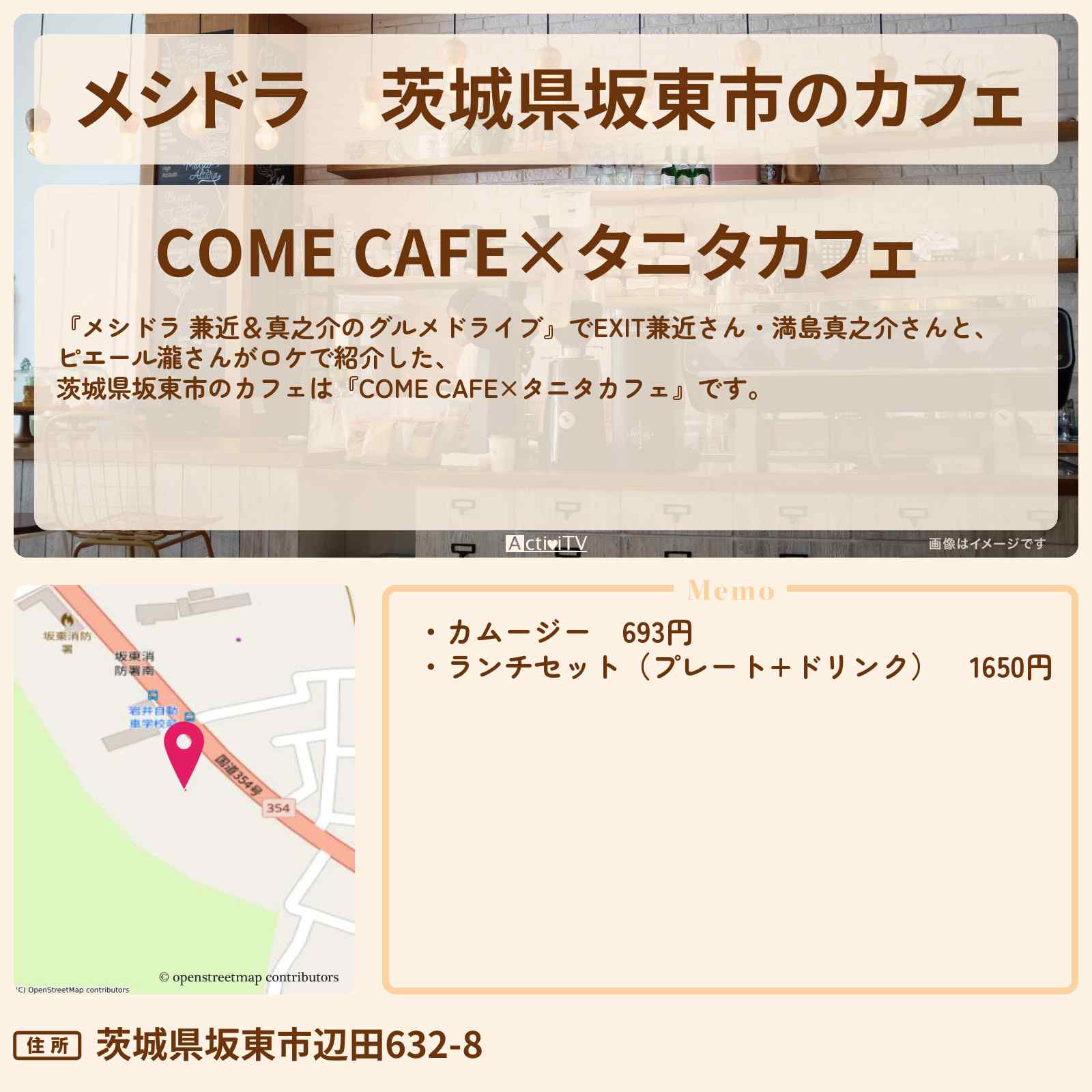 カムカフェ × タニタカフェは、茨城県坂東市にある茨城初のタニタカフェコラボ店です。野菜たっぷりのメニューとレトロな固めプリンで癒しのひとときをお楽しみください。テラス席はペットOK、託児スペースも完備。営業時間は8:00〜17:00(日祝休み)。テイクアウトも可能です。
