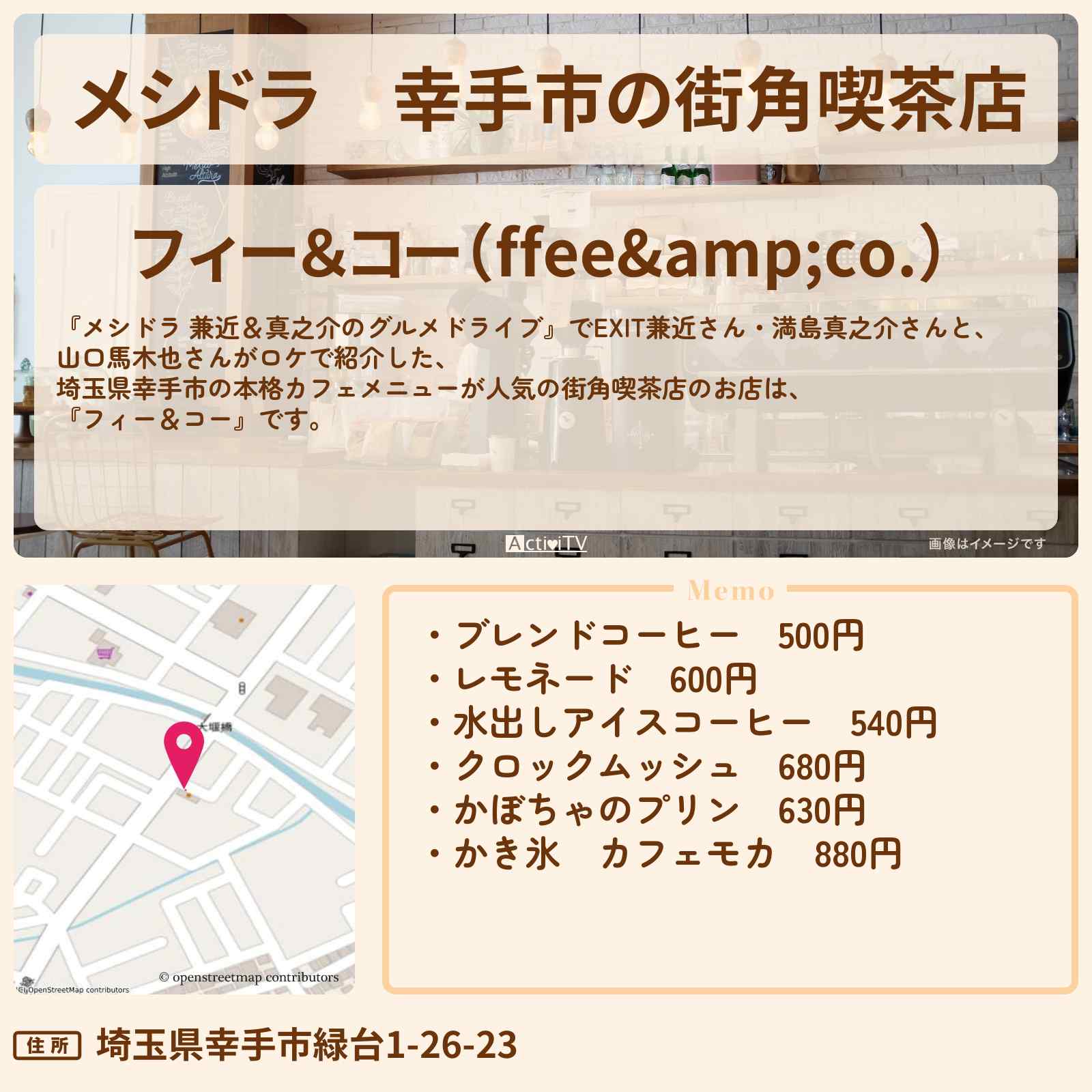 【メシドラ】幸手市の街角喫茶店『フィー&コー』お店情報〔EXIT兼近・満島真之介・山口馬木也〕