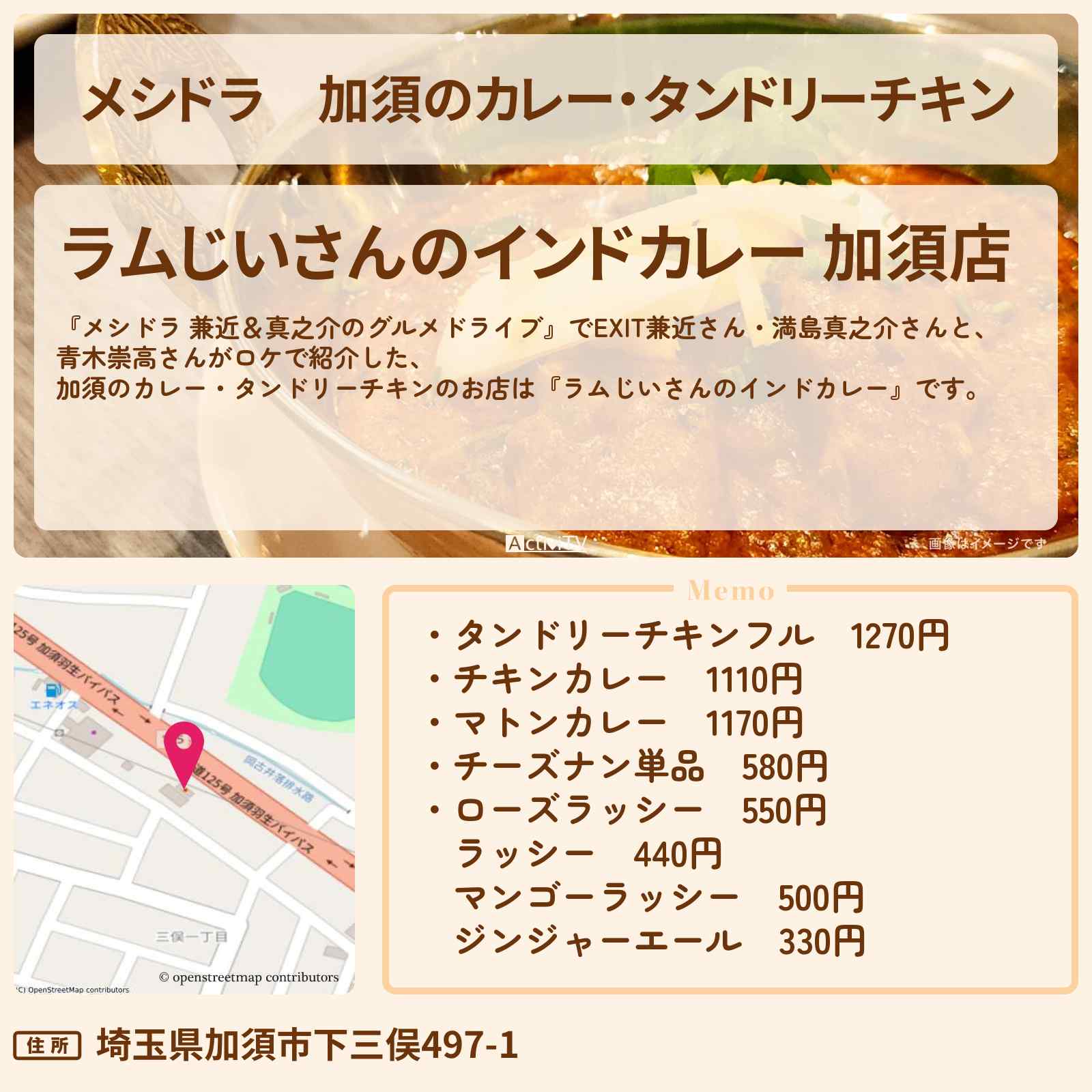 放送の【メシドラ 兼近&真之介のグルメドライブ】でEXIT兼近さん・満島真之介さんと、青木崇高さんがロケで紹介した、加須のカレー・タンドリーチキンのお店は『ラムじいさんのインドカレー』です。
