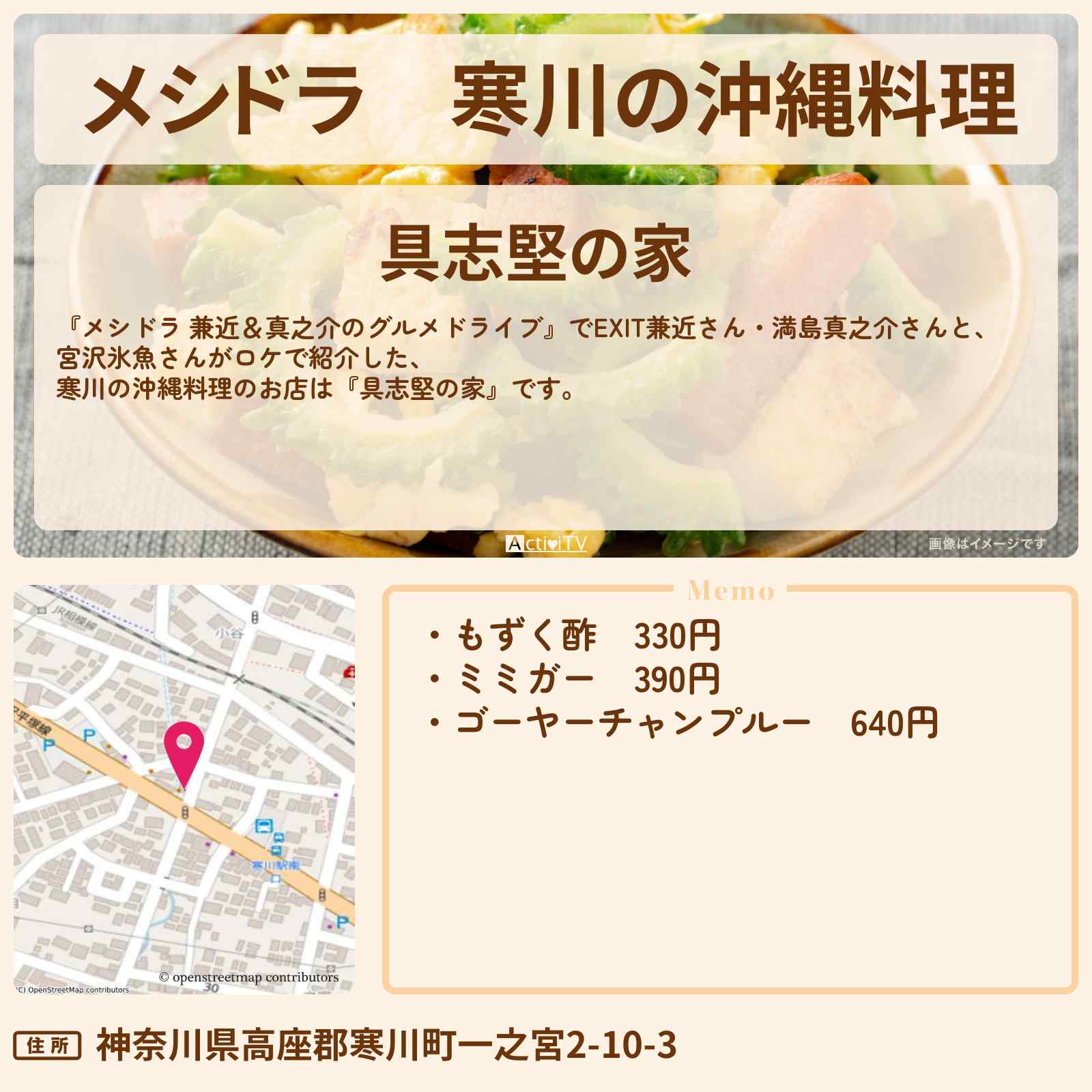 JR相模線寒川駅南口から徒歩約3分という好立地にありながら、静かな住宅街に佇む一軒家の店構えが特徴的で、店先にはオリオンビールの紅白提灯が賑やかに灯り、シーサーが出迎えてくれます。