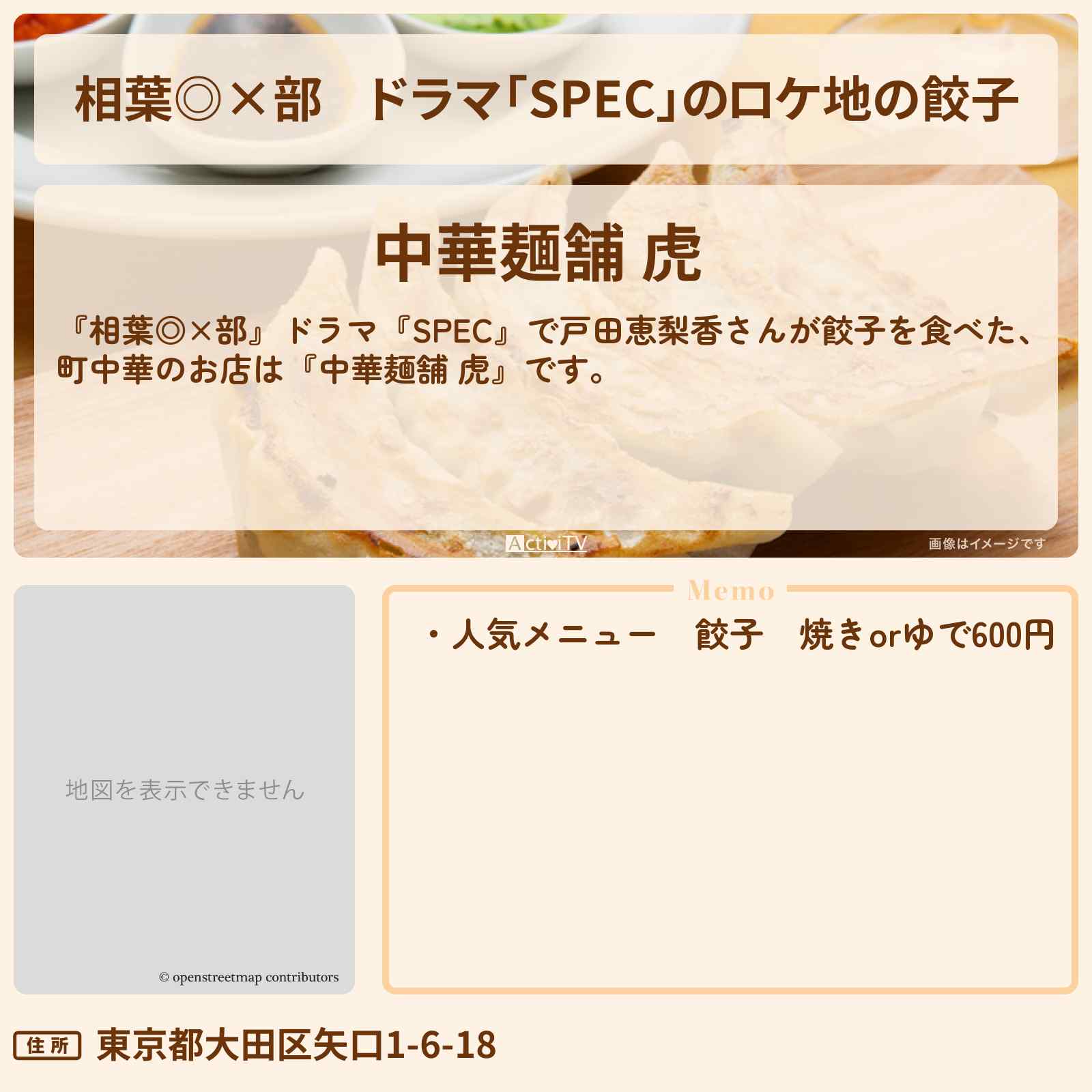 放送の【相葉◎×部】ドラマ『SPEC』で戸田恵梨香さんが餃子を食べた、町中華のお店は『中華麺舗 虎』です。