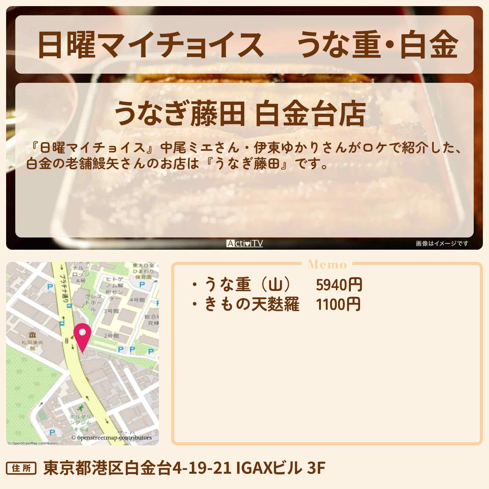 放送の【日曜マイチョイス】中尾ミエさん・伊東ゆかりさんがロケで紹介した、白金の老舗鰻矢さんのお店は『うなぎ藤田』です。
