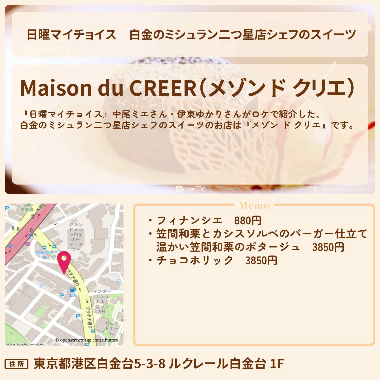 放送の【日曜マイチョイス】中尾ミエさん・伊東ゆかりさんがロケで紹介した、白金のミシュラン二つ星店シェフのスイーツのお店は『メゾン ド クリエ』です。