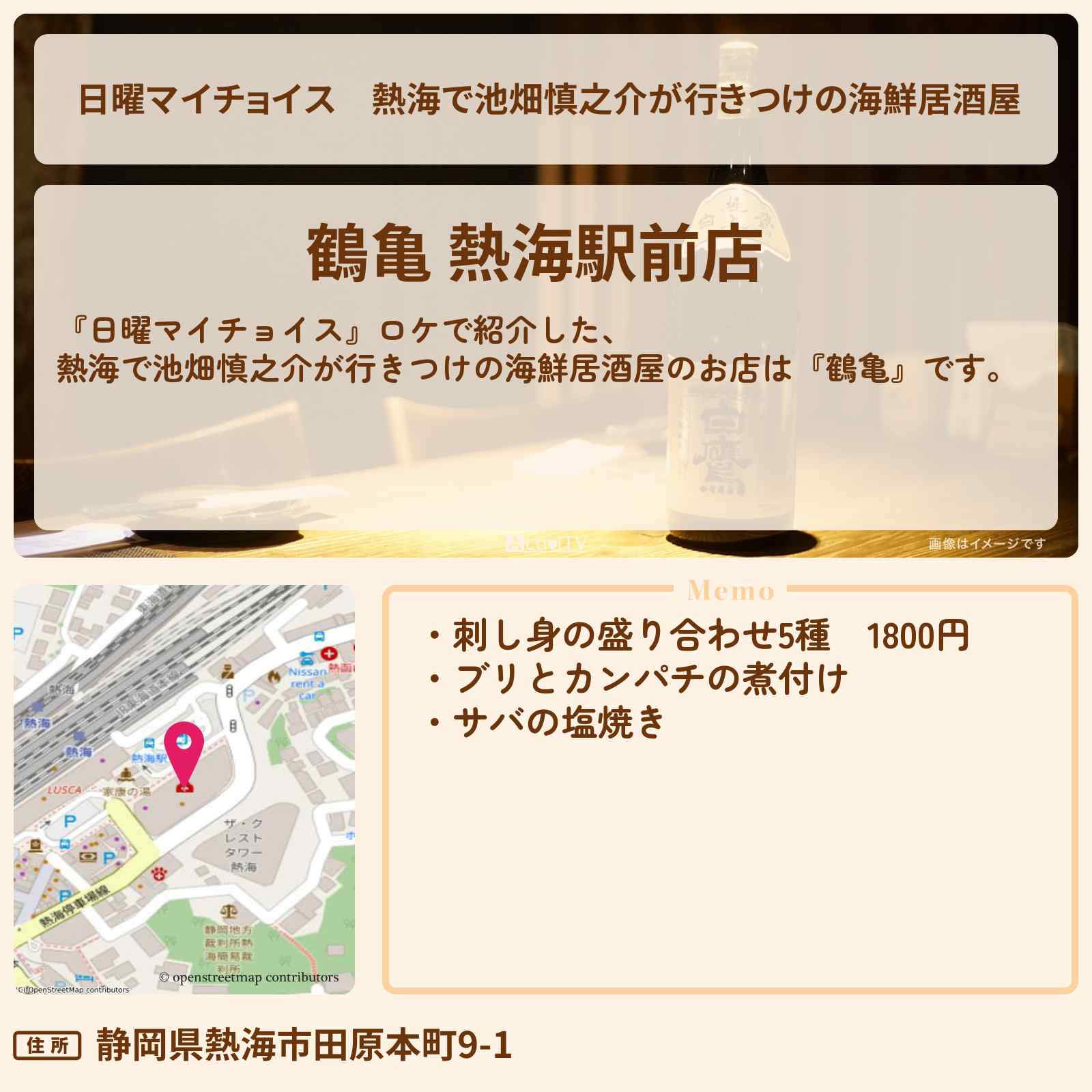放送の【日曜マイチョイス】ロケで紹介した、熱海で池畑慎之介が行きつけの海鮮居酒屋のお店は『鶴亀』です。