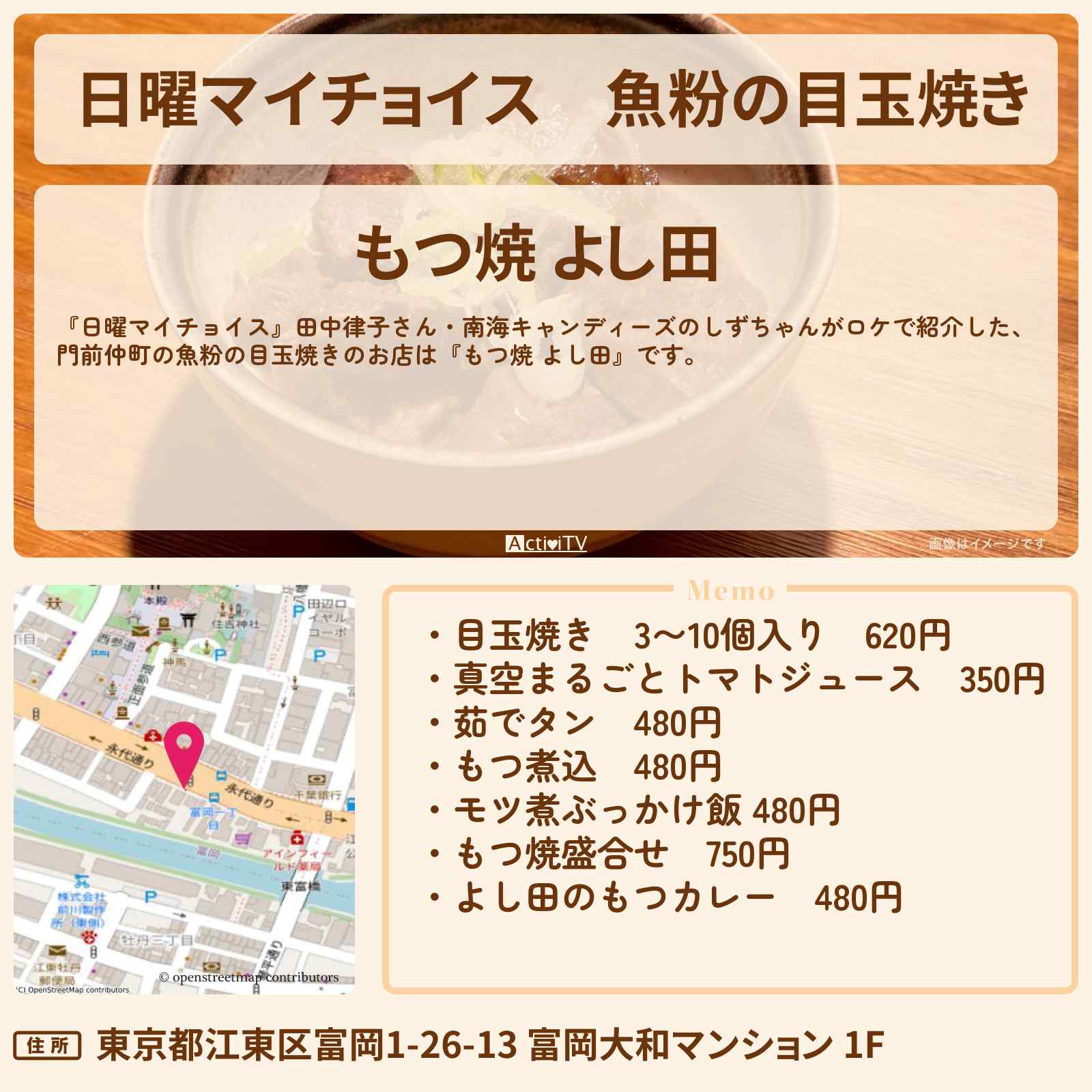 | 住所 | 東京都江東区富岡1-26-13 富岡大和マンション 1F |