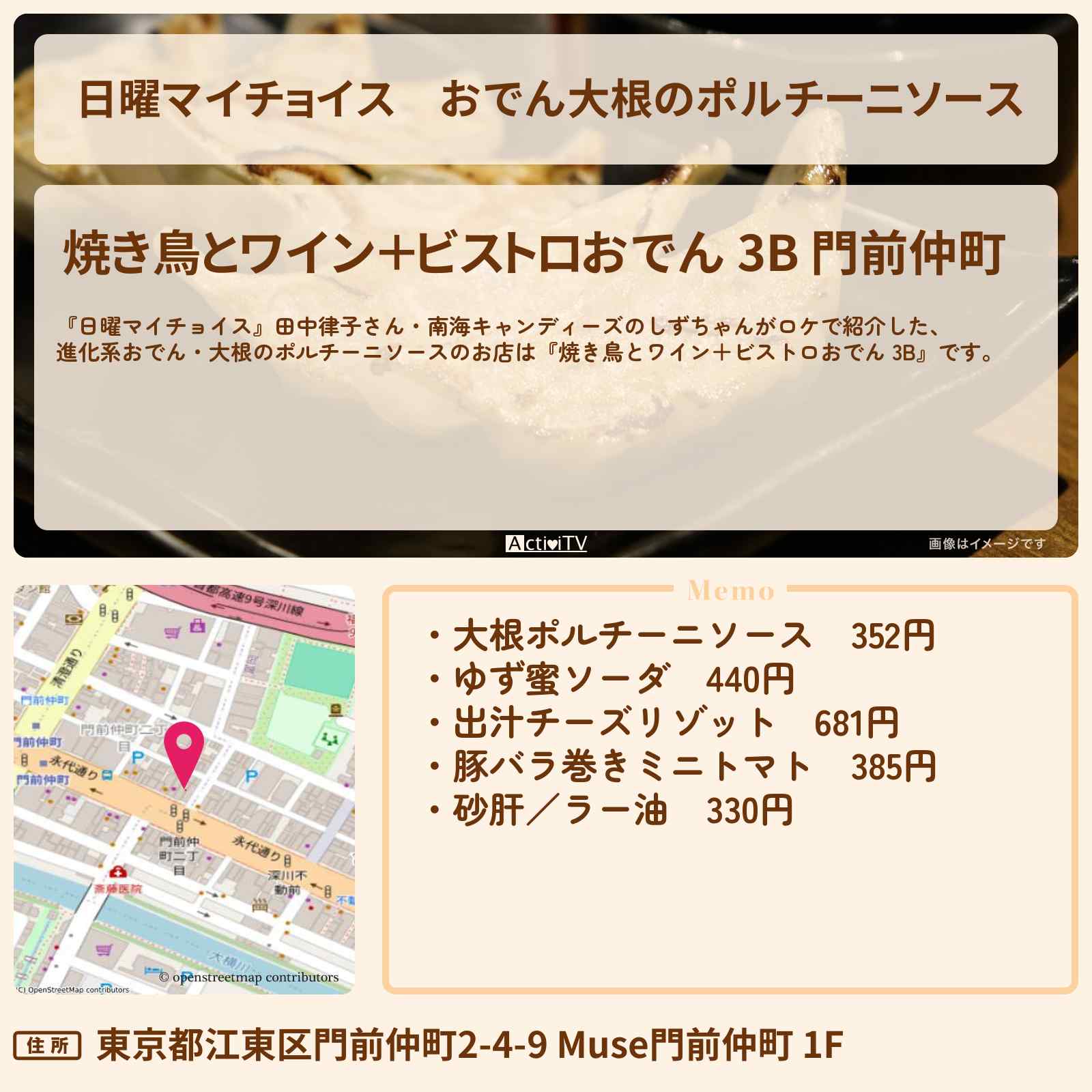 おでん大根のポルチーニソース 門前仲町駅「焼き鳥とワイン+ビストロおでん 3B 門前仲町」