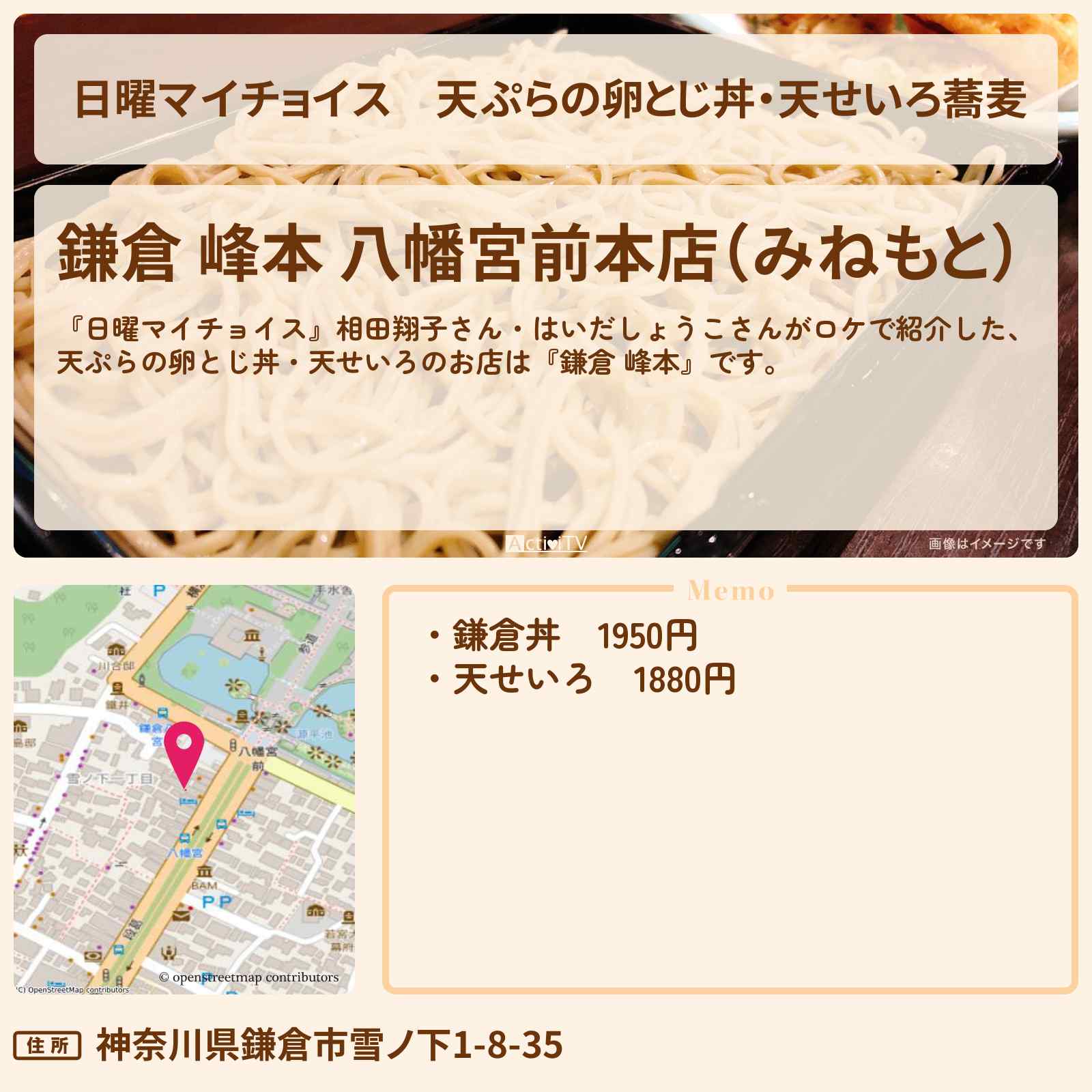 放送の【日曜マイチョイス】相田翔子さん・はいだしょうこさんがロケで紹介した、天ぷらの卵とじ丼・天せいろのお店は『鎌倉 峰本』です。