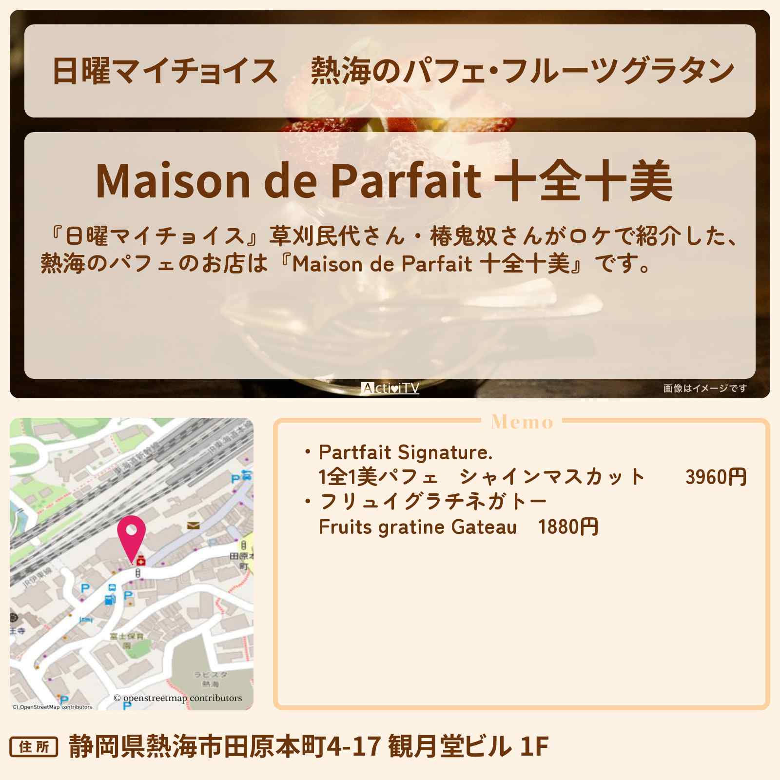 こちらは『Maison de Parfait 十全十美(熱海/パフェ)』のお店ページです。実名でのオススメが3件集まっています。Rettyで食が好きなグルメな人たちからお店を探そう!