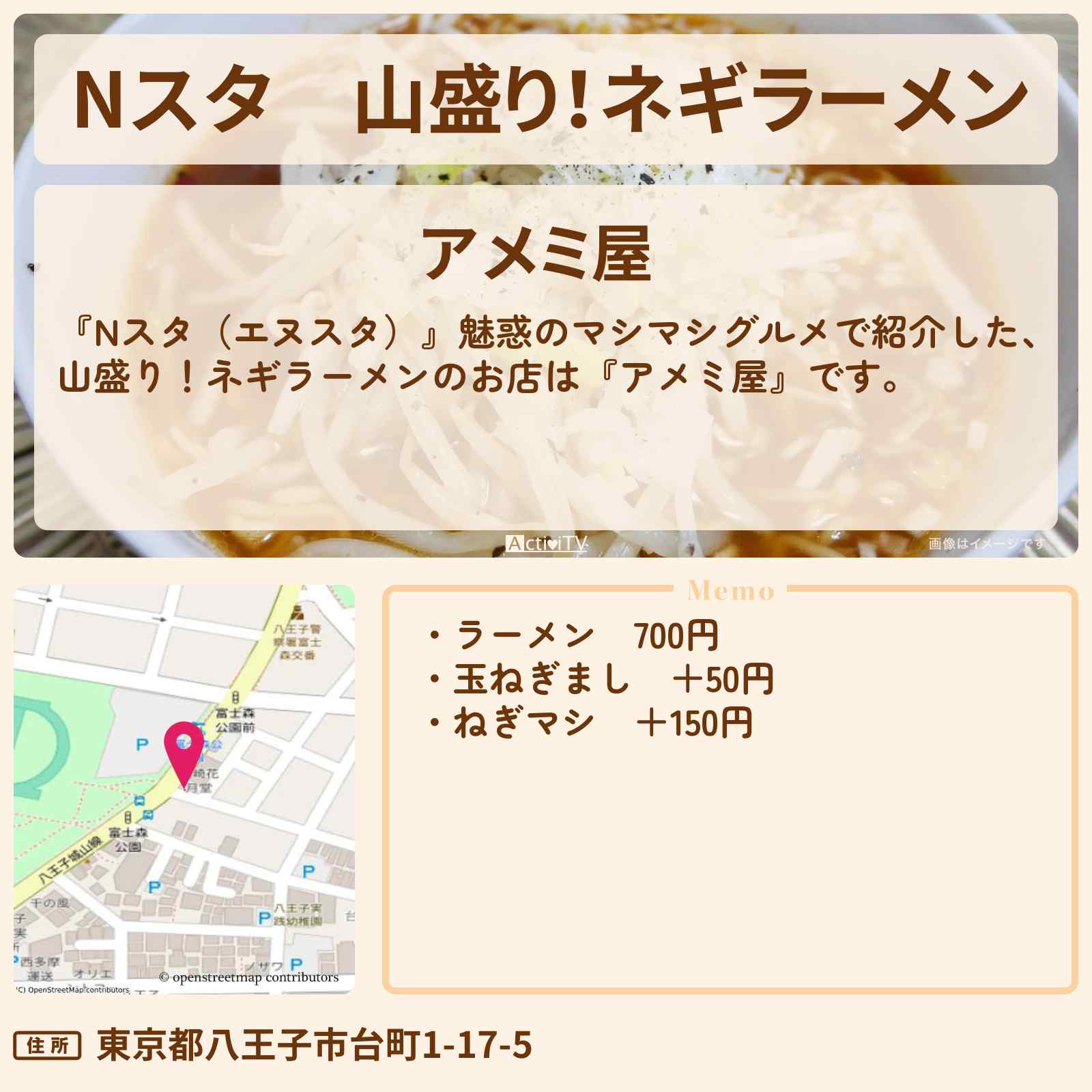放送の【Nスタ(エヌスタ)】魅惑のマシマシグルメで紹介した、山盛り!ネギラーメンのお店は『アメミ屋』です。