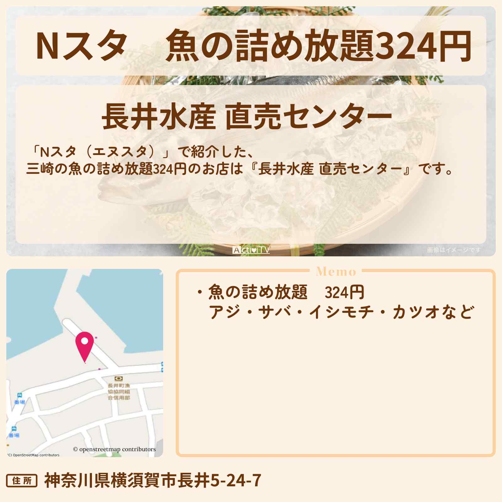 放送の「Nスタ(エヌスタ)」で紹介した、三崎の魚の詰め放題324円のお店は『長井水産 直売センター』です。