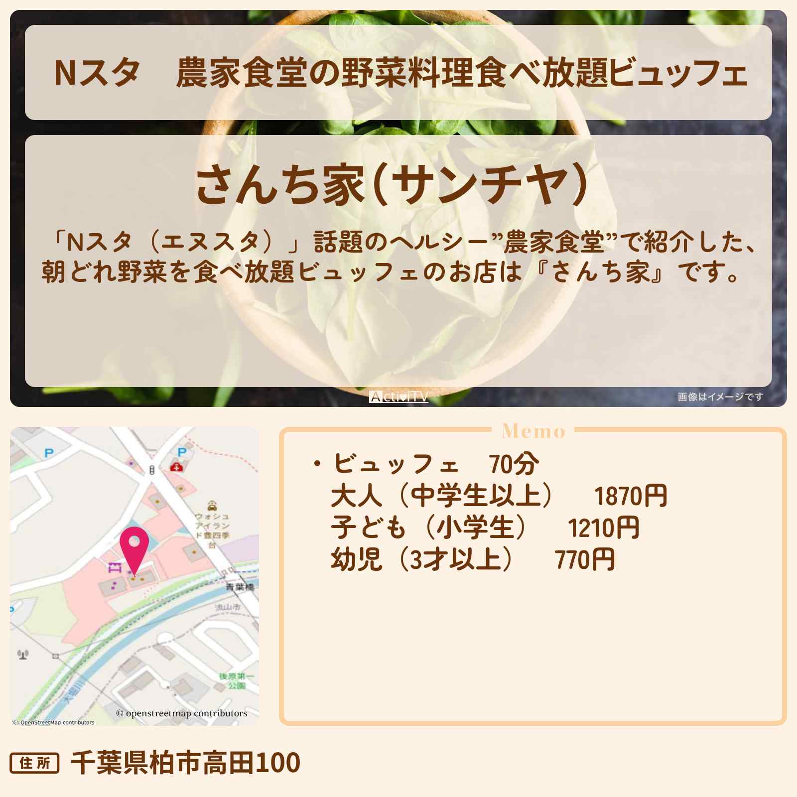 放送の「Nスタ(エヌスタ)」話題のヘルシー”農家食堂”で紹介した、朝どれ野菜を食べ放題ビュッフェのお店は『さんち家』です。
