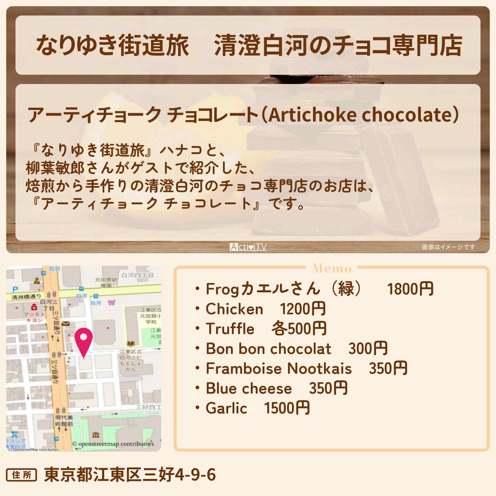 放送の【なりゆき街道旅】ハナコと、柳葉敏郎さんがゲストで紹介した、焙煎から手作りの清澄白河のチョコ専門店のお店は、『アーティチョーク チョコレート』です。