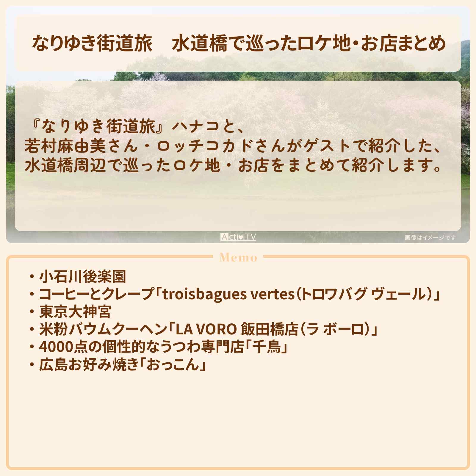 小石川後楽園からスタートし、米粉バウムクーヘンのラ ボーロ、広島お好み焼きのおっこん・個性派絶品クレープとこだわりドリップコーヒーのトロワバグ ヴェールなどのお店を巡りました。