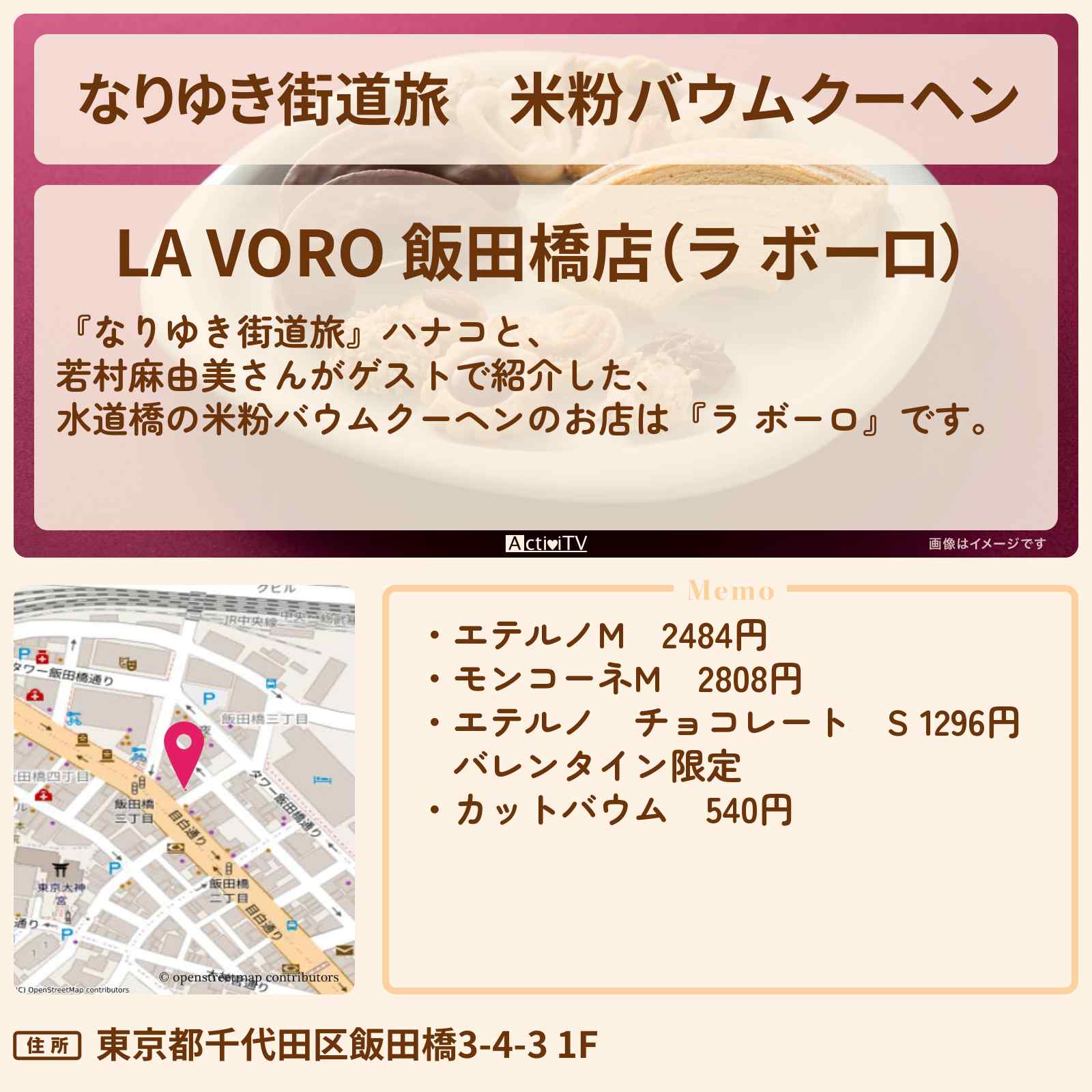 放送の【なりゆき街道旅】ハナコと、若村麻由美さんがゲストで紹介した、水道橋の米粉バウムクーヘンのお店は『ラ ボーロ』です。