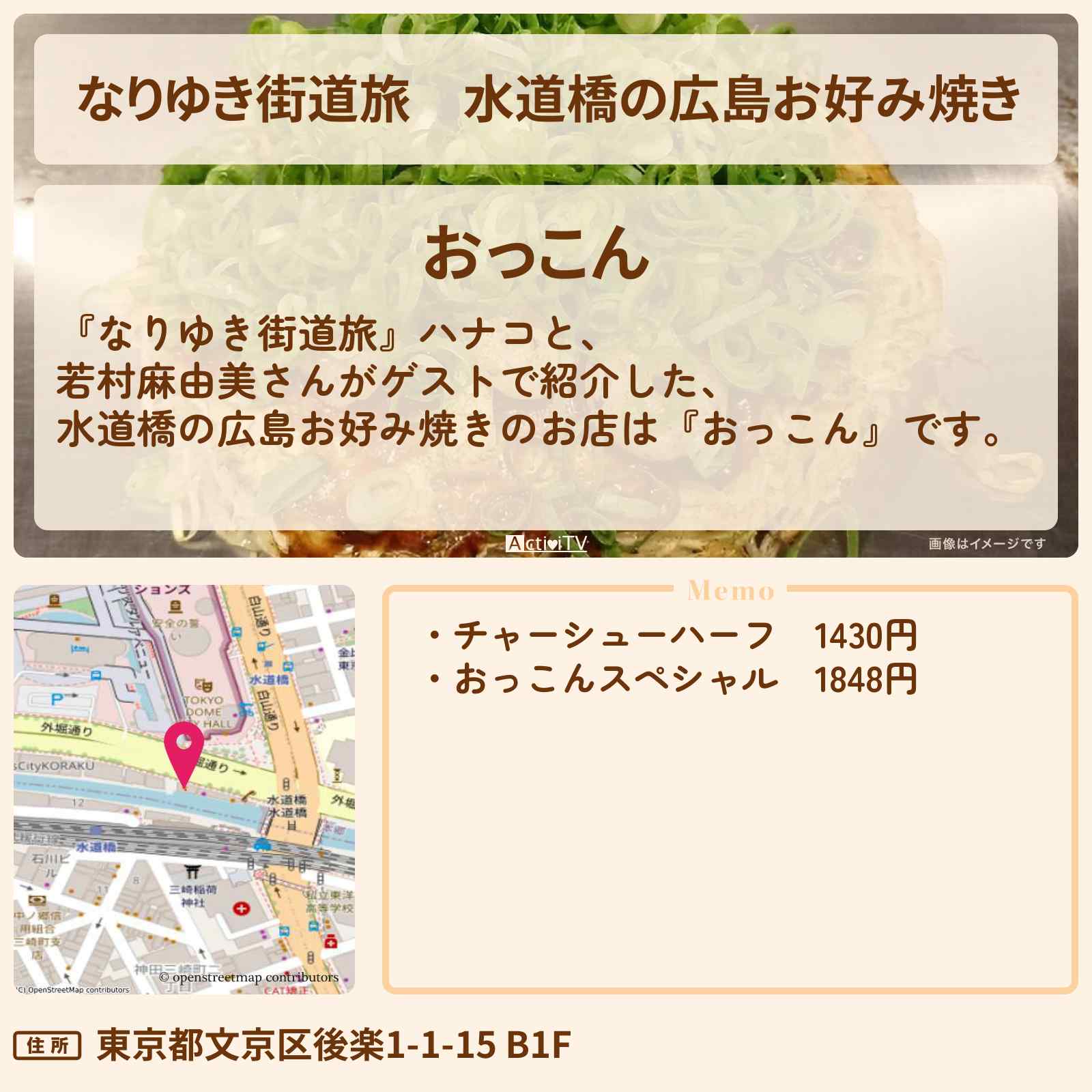 放送の【なりゆき街道旅】ハナコと、若村麻由美さんがゲストで紹介した、水道橋の広島お好み焼きのお店は『おっこん』です。
