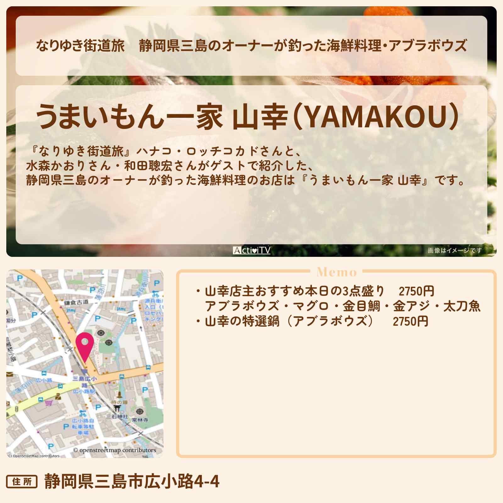 放送の【なりゆき街道旅】ハナコ・ロッチコカドさんと、水森かおりさん・和田聰宏さんがゲストで紹介した、静岡県三島のオーナーが釣った海鮮料理のお店は『うまいもん一家 山幸』です。