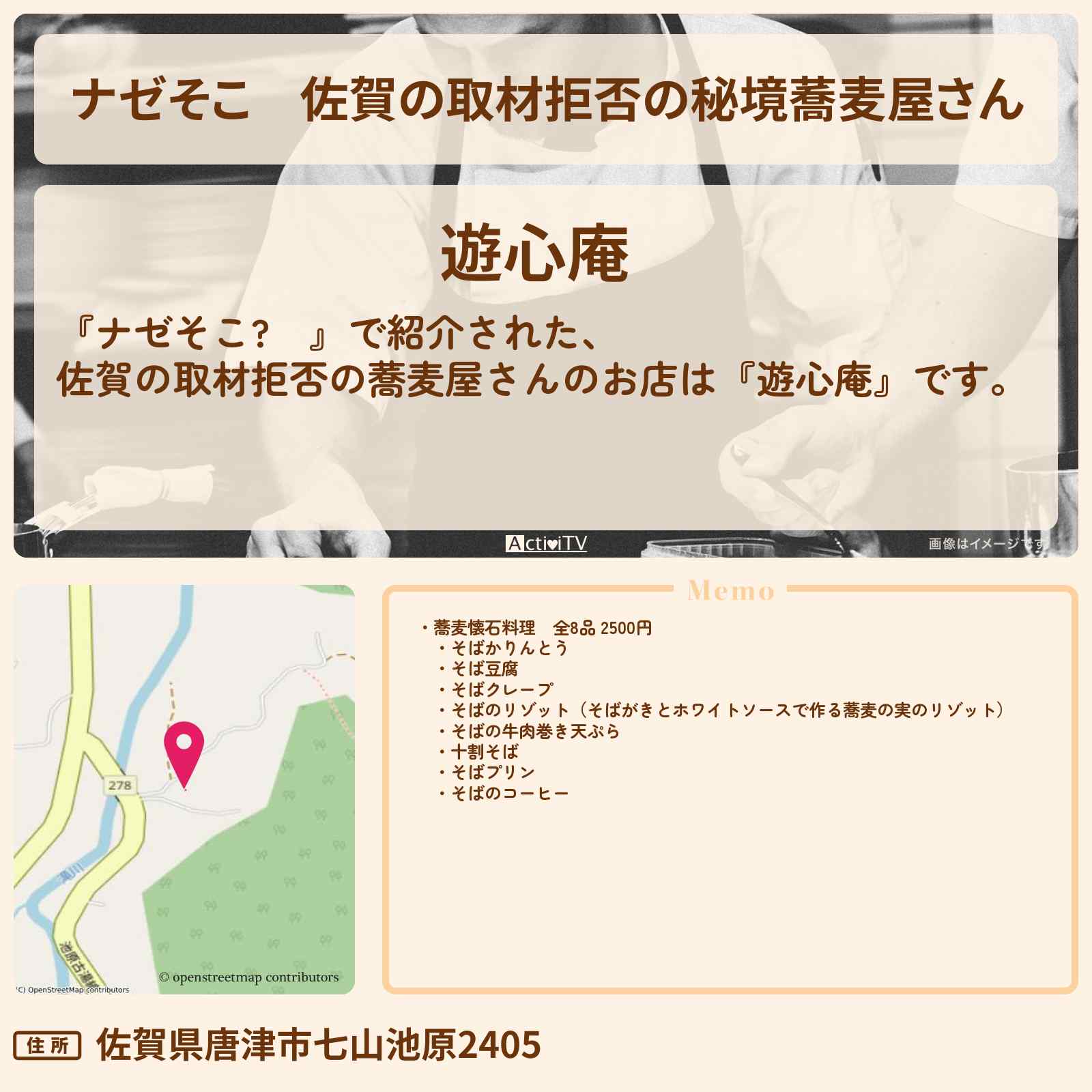 放送の【ナゼそこ? 】で紹介された、佐賀の取材拒否の蕎麦屋さんのお店は『遊心庵』です。