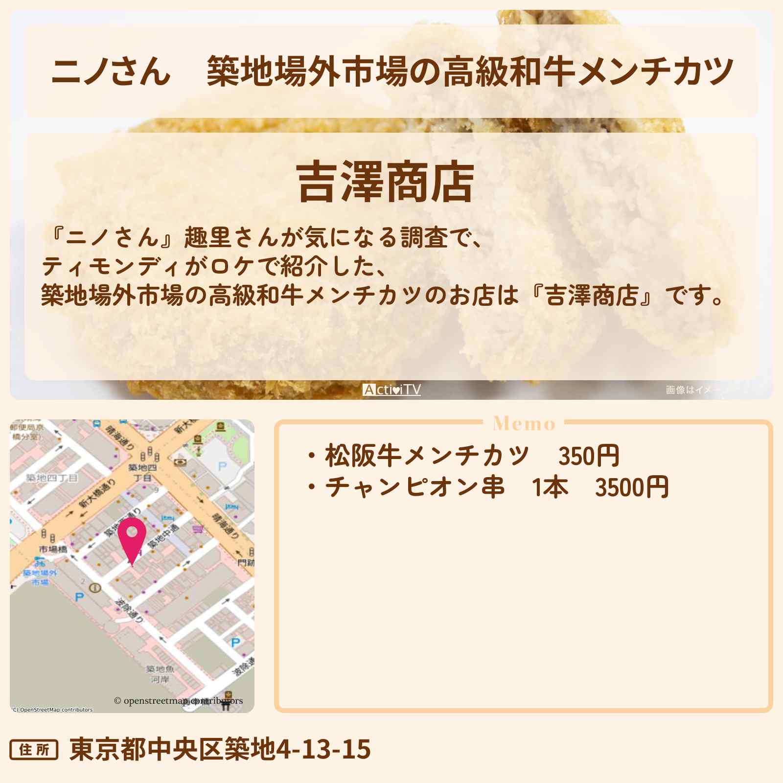 放送の【ニノさん】趣里さんが気になる調査で、ティモンディがロケで紹介した、築地場外市場の高級和牛メンチカツのお店は『吉澤商店』です。