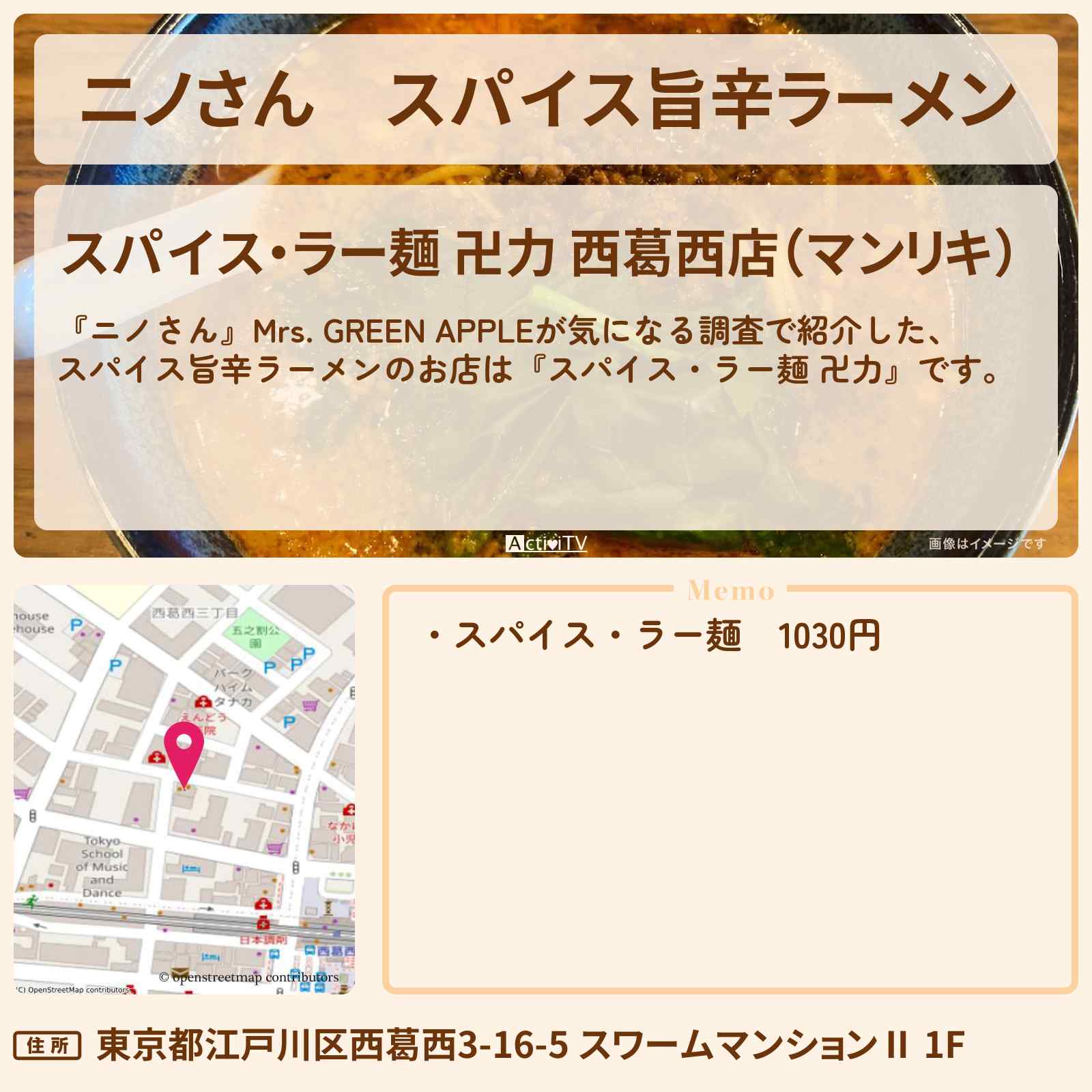 放送の【ニノさん】Mrs. GREEN APPLEが気になる調査で紹介した、スパイス旨辛ラーメンのお店は『スパイス・ラー麺 卍力』です。