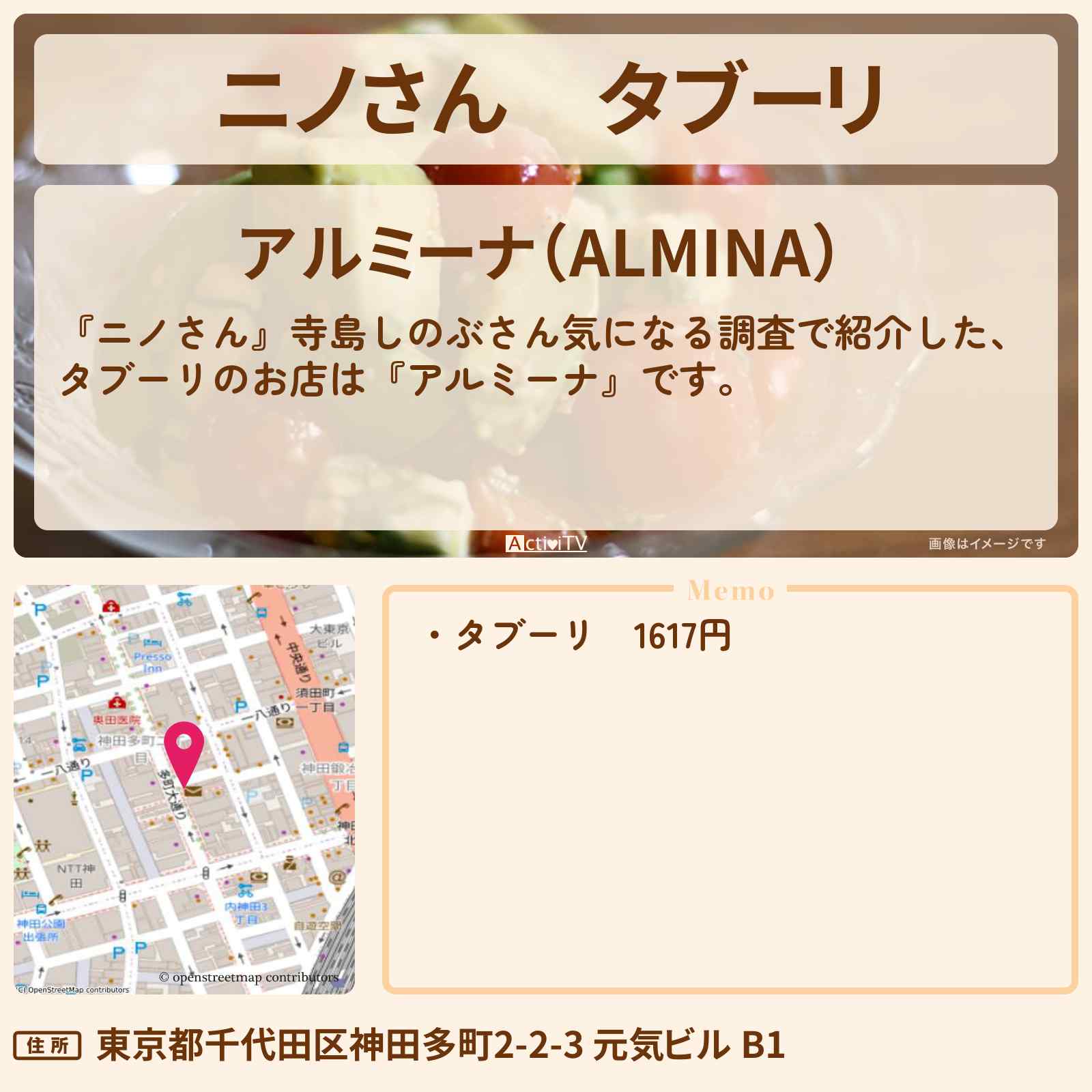 番組では寺島しのぶさんがモルディブで食べた思い出のタブーリを求めて、紅しょうががロケをしました。タブーリは、タブーリは80%がイタリアンパセリで、それに、タマネギ・トマト・ブルゴル・ミント・ネギを使った中東を代表するサラダで、アルミーナでは新鮮な食材を使用し、さっぱりとした風味が評判です。