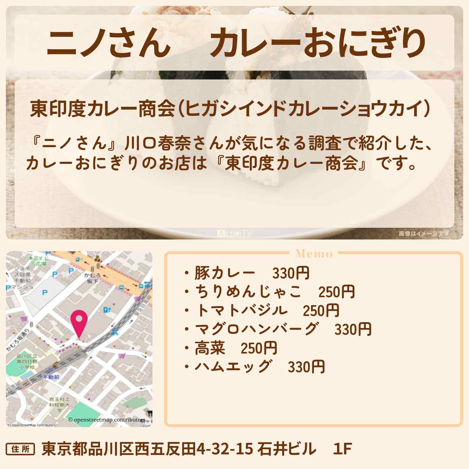 放送の【ニノさん】川口春奈さんが気になる調査で紹介した、カレーおにぎりのお店は『東印度カレー商会』です。