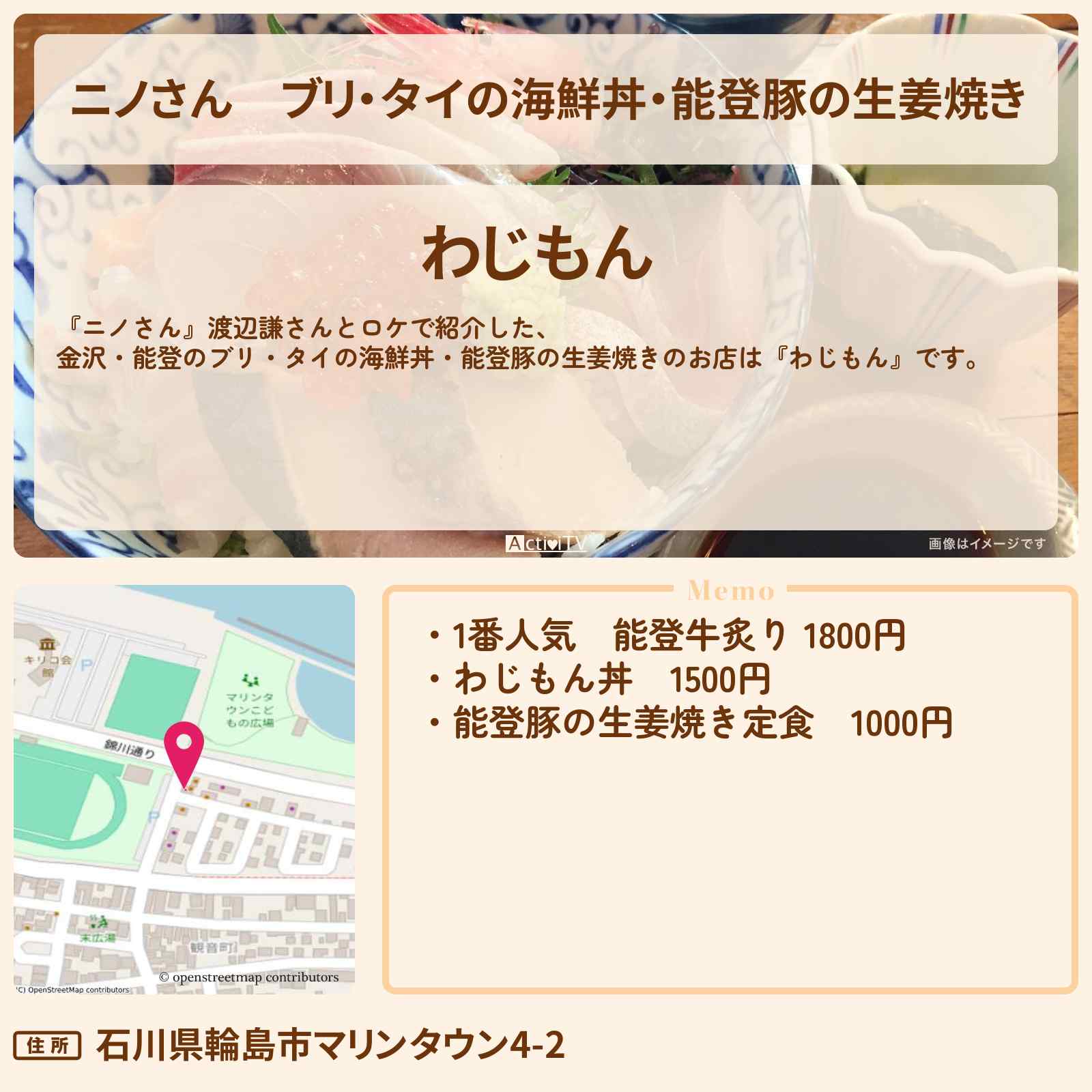 放送の【ニノさん】渡辺謙さんとロケで紹介した、金沢・能登のブリ・タイの海鮮丼・能登豚の生姜焼きのお店は『わじもん』です。