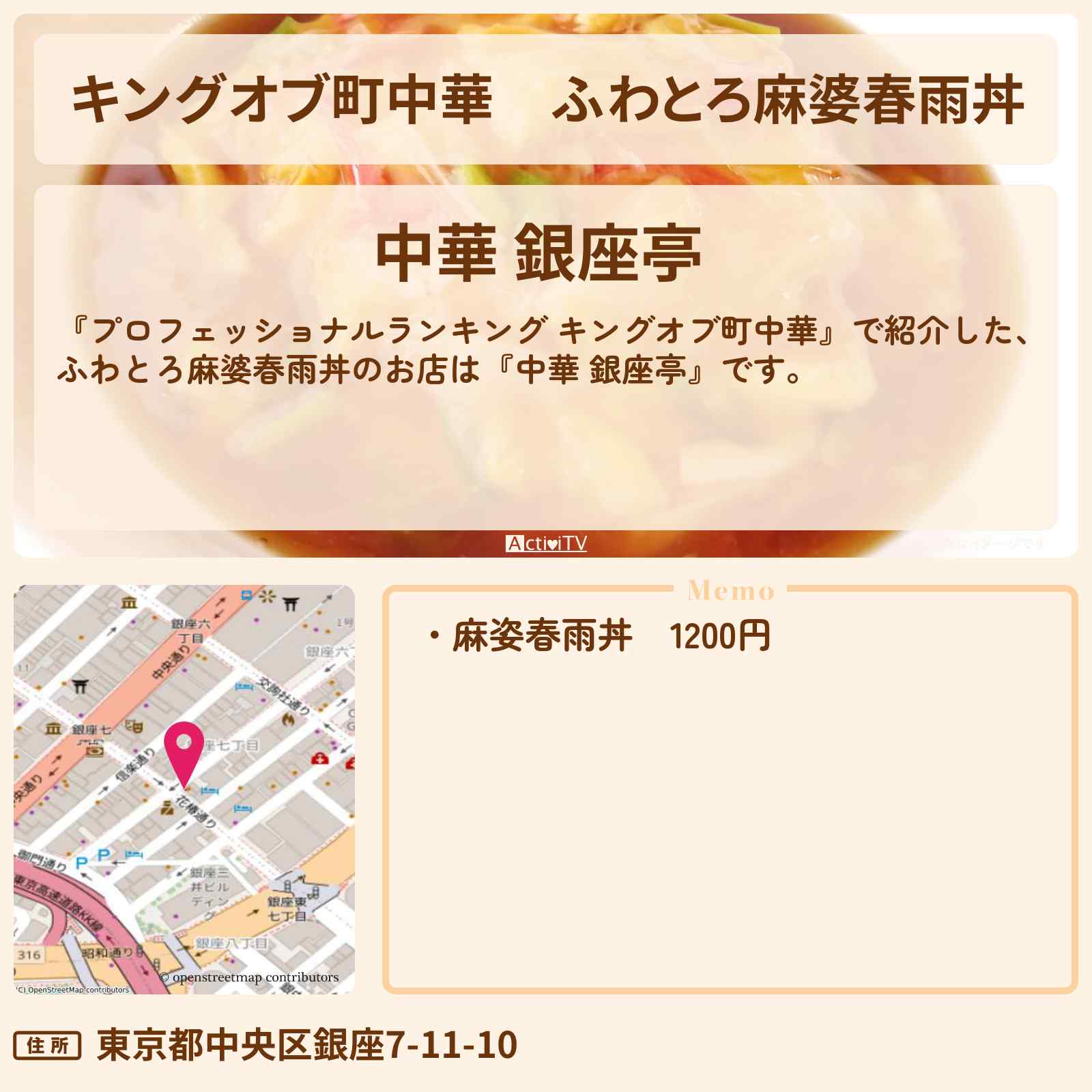 麻婆春雨丼 東銀座駅「中華 銀座亭」