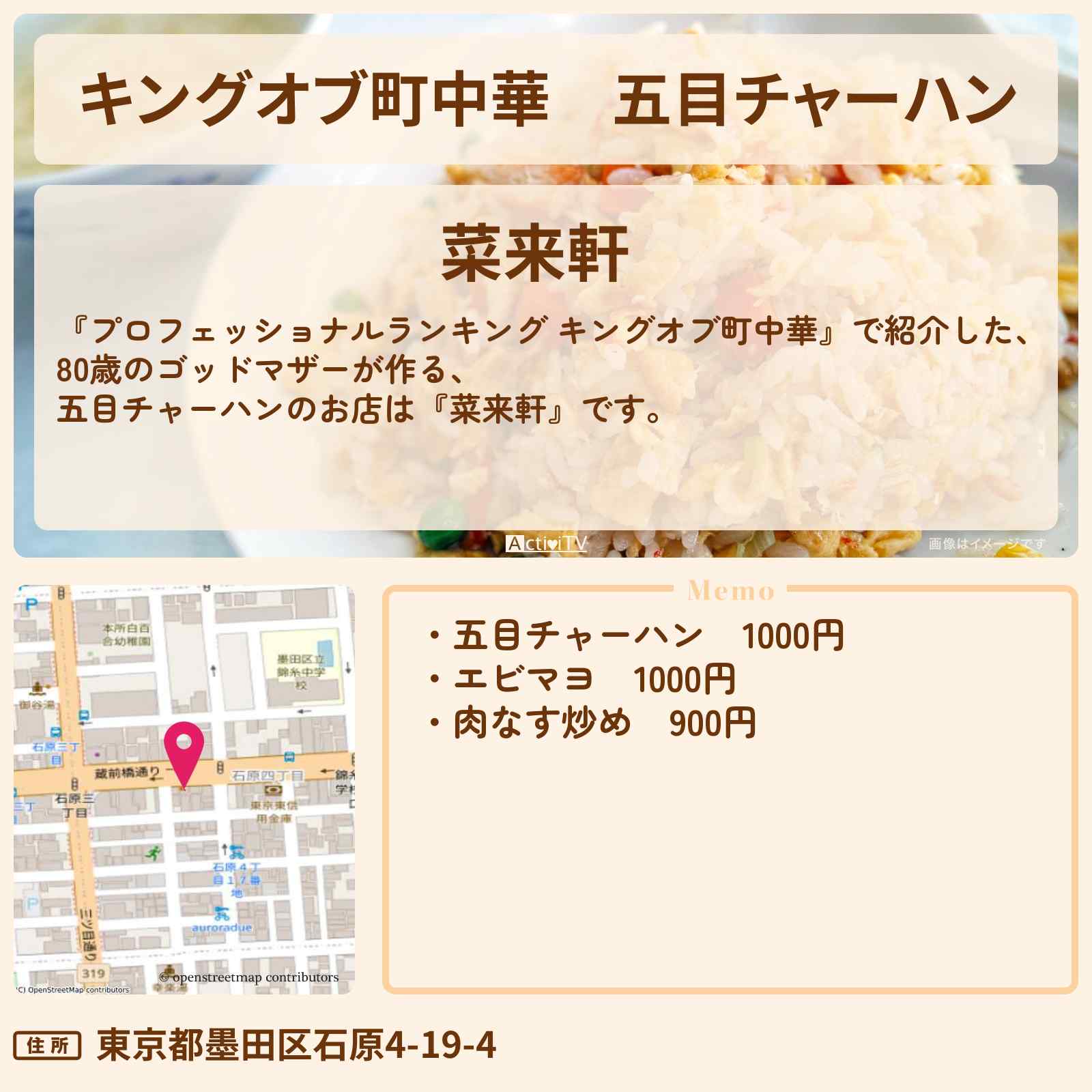 【キングオブ町中華】五目チャーハン『菜来軒(錦糸町)』80歳のゴットマザーのお店の情報