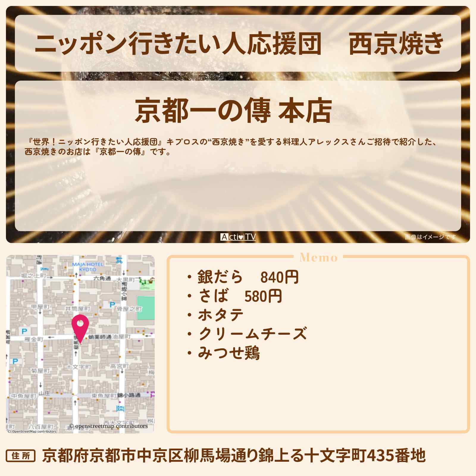 西京漬け 京都一の傳 ― 本場・京都の西京漬けの老舗。お取り寄せやご贈答に最適な、こだわりの西京漬けを販売。店舗では京懐石ランチも楽しめます。四条烏丸下車、錦市場近く。…