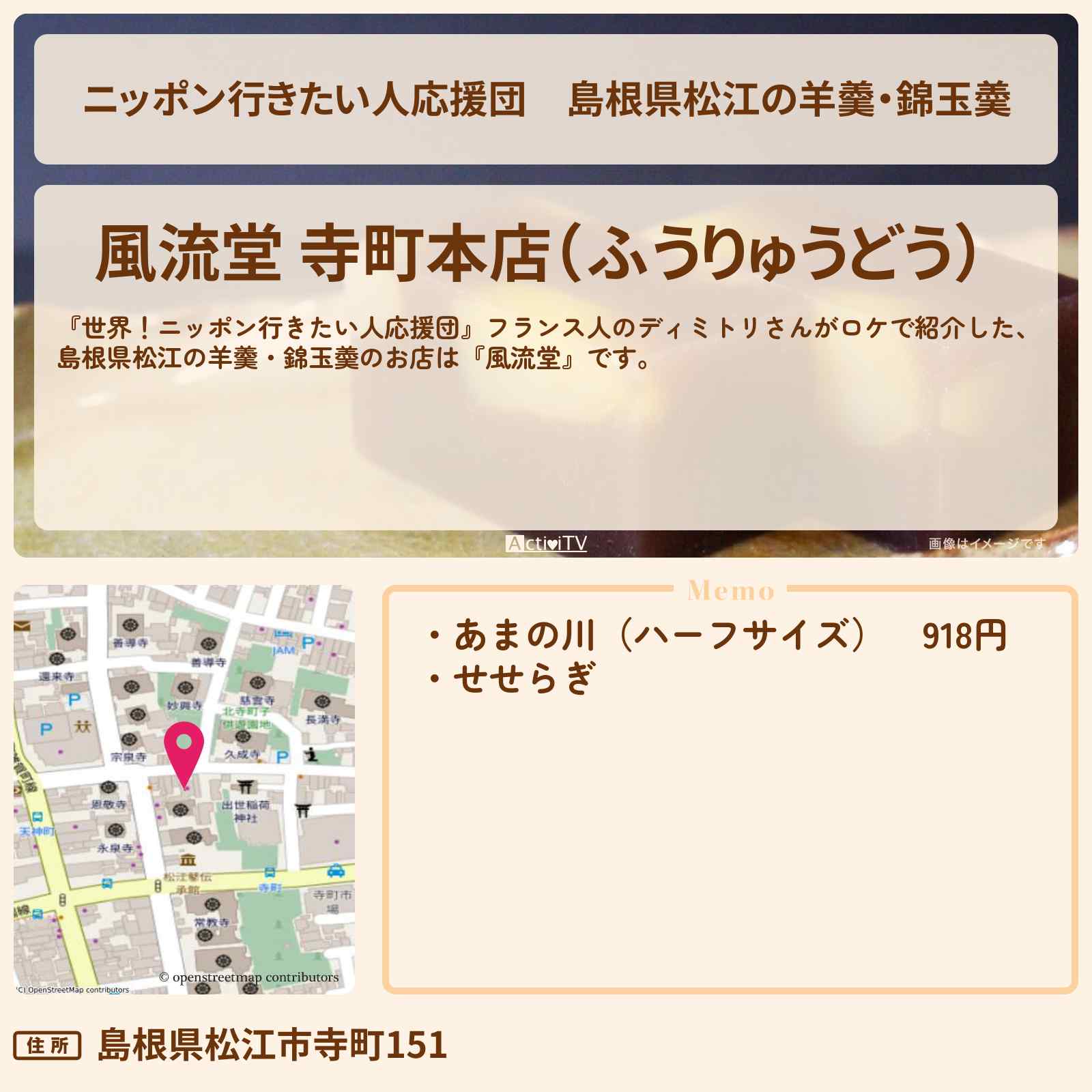 (月)放送の【世界!ニッポン行きたい人応援団】フランス人のディミトリさんがロケで紹介した、島根県松江の羊羹・錦玉羮のお店は『風流堂』です。