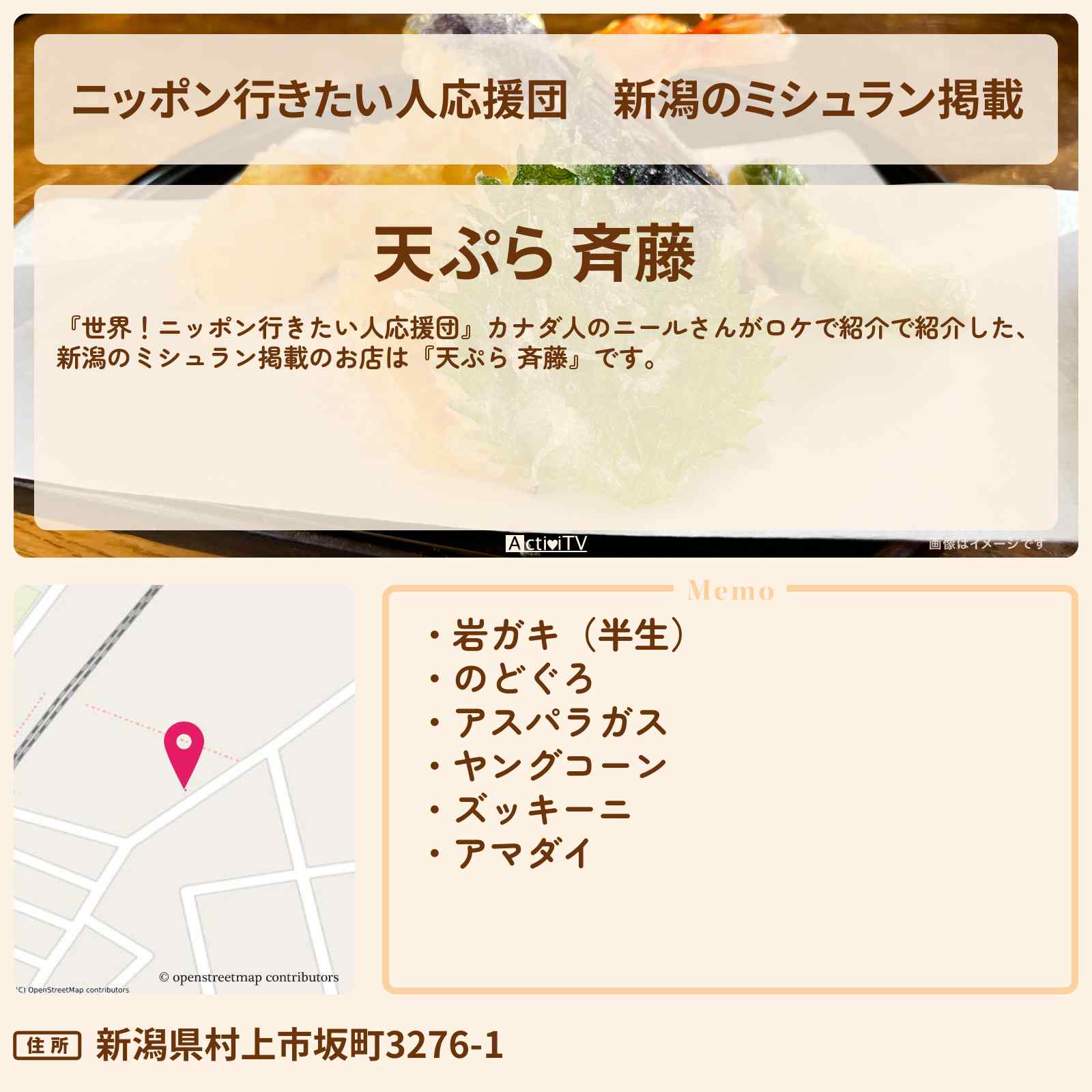 店主の斉藤丈司さんは1977年村上市生まれで、大阪の辻調理師専門学校を卒業後、創業175年に大阪で最古の天ぷら店といわれる「てんぷらの一宝」や懐石料理店で腕を磨きました。20代後半で一度地元に戻ってラーメン店で修業した後、金沢の「天ぷら小泉」で天ぷら職人としてさらなる経験を積み重ねました。そして2015年、故郷村上市で念願の天ぷら専門店をオープンしました。