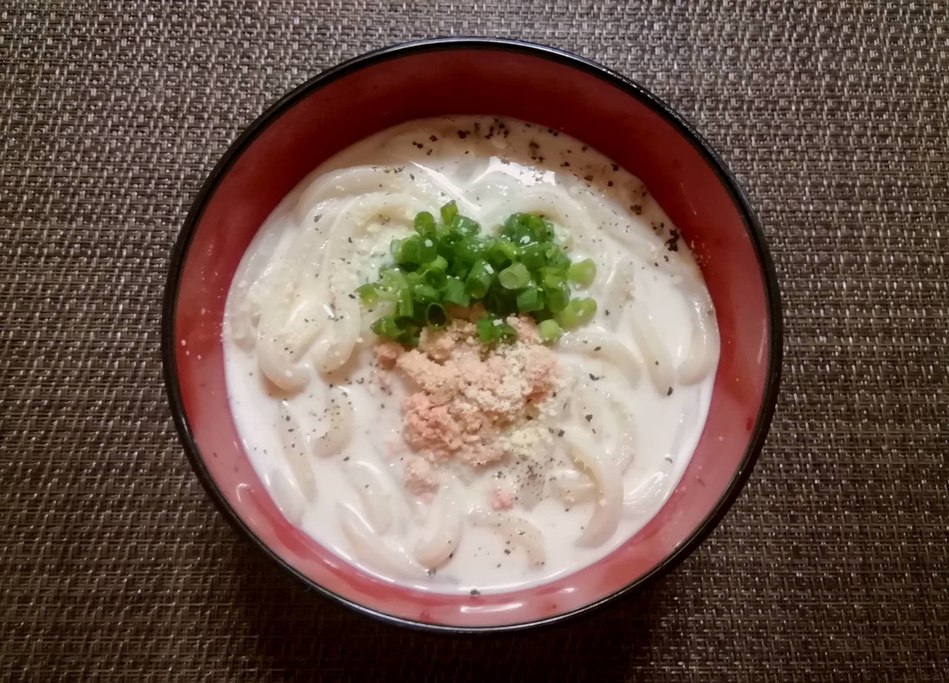• うどんは袋の表示どおりに温めて器に盛り、うどんと具材をトッピングし万能ネギを散らし、ラー油をかける