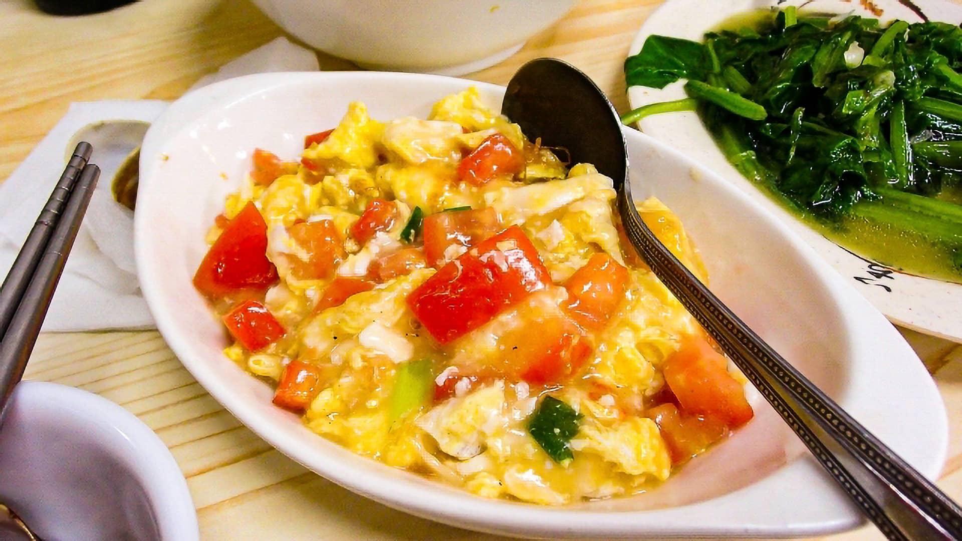 - トマトの皮がめくれ始めたら、ゆで卵を加えて溶いた卵を流し入れ、数回大きく混ぜて火を通す