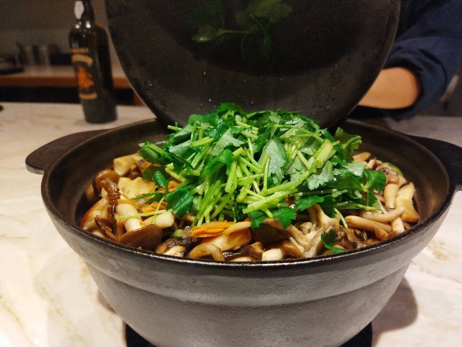 - 土鍋のフタの穴から蒸気が出てきたら、中火にして5分