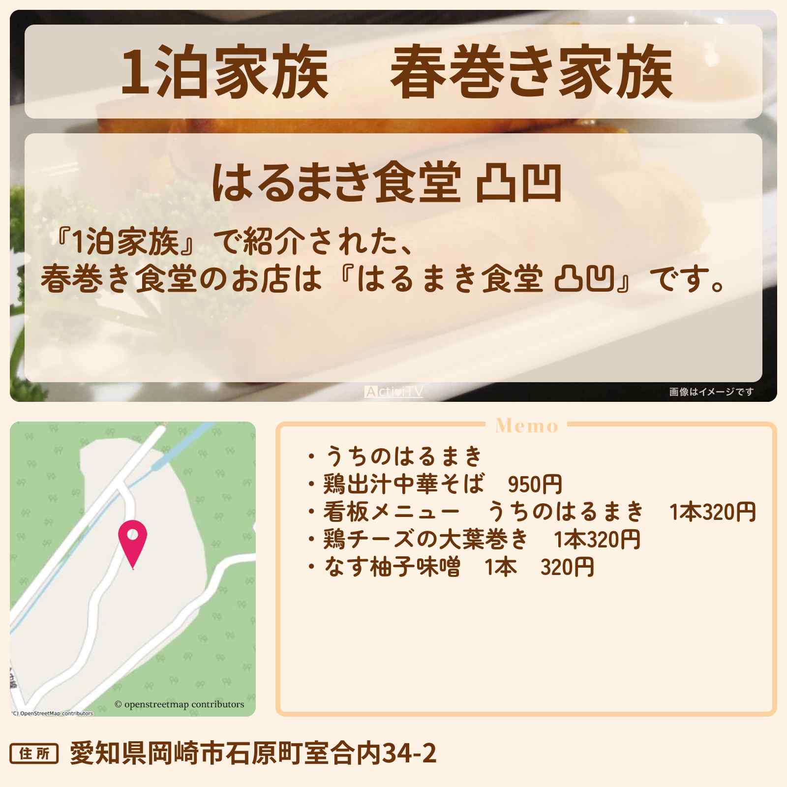 放送の【1泊家族】で紹介された、春巻き食堂のお店は『はるまき食堂 凸凹』です。