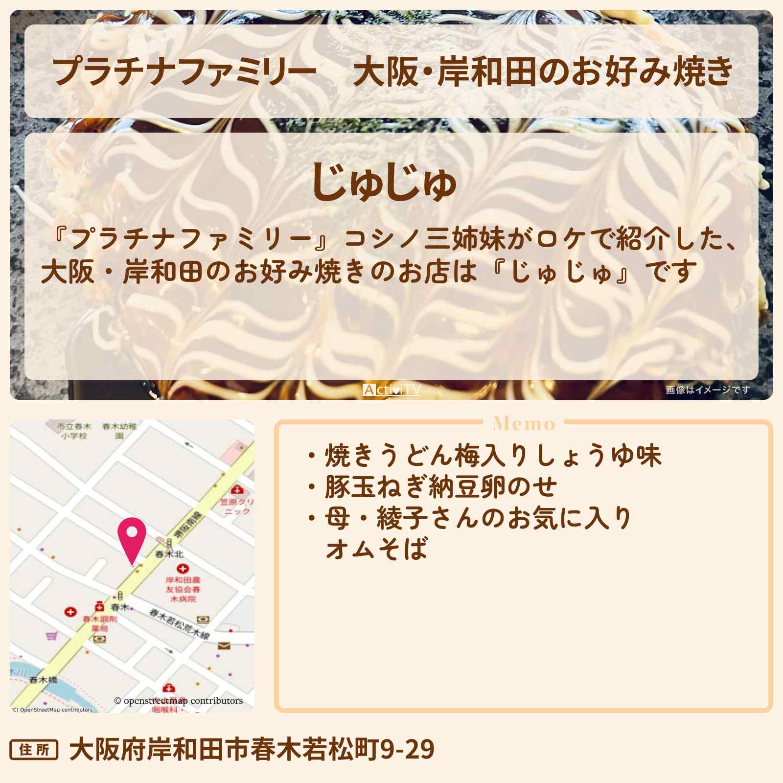 放送の【プラチナファミリー】コシノ三姉妹がロケで紹介した、大阪・岸和田のお好み焼きのお店は『じゅじゅ』です