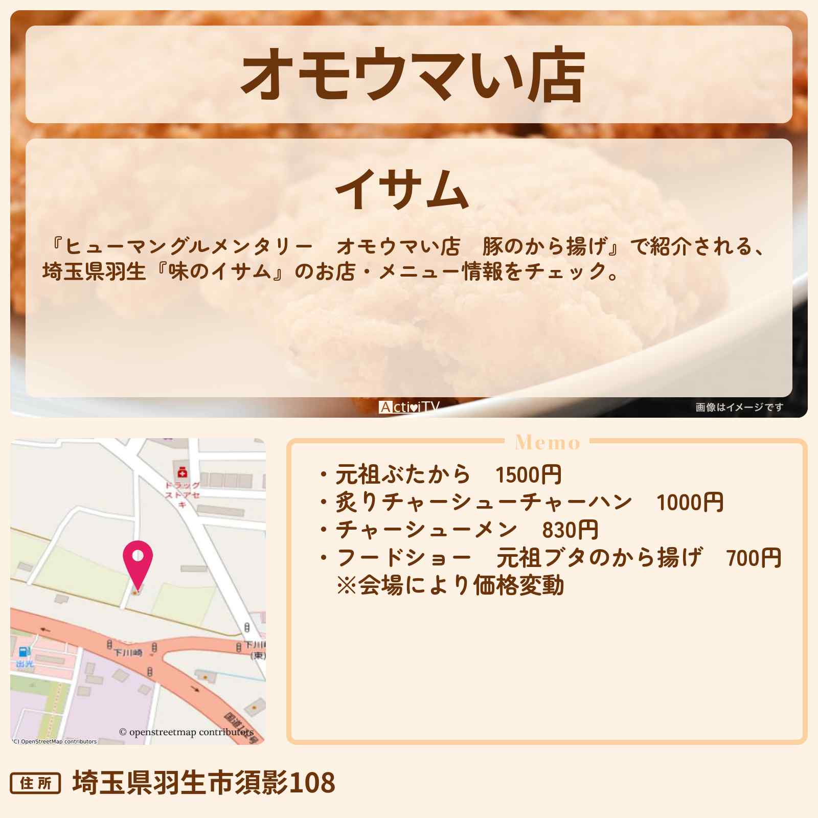 2023年3月14日放送の【ヒューマングルメンタリー オモウマい店 豚のから揚げ】で紹介される、埼玉県羽生『味のイサム』のお店・メニュー情報をチェック。