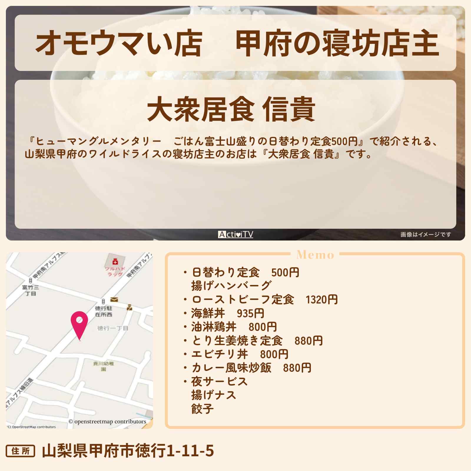 2023年4月18日放送の【ヒューマングルメンタリー ごはん富士山盛りの日替わり定食500円】で紹介される、山梨県甲府のワイルドライスの寝坊店主のお店は『大衆居食 信貴』です。