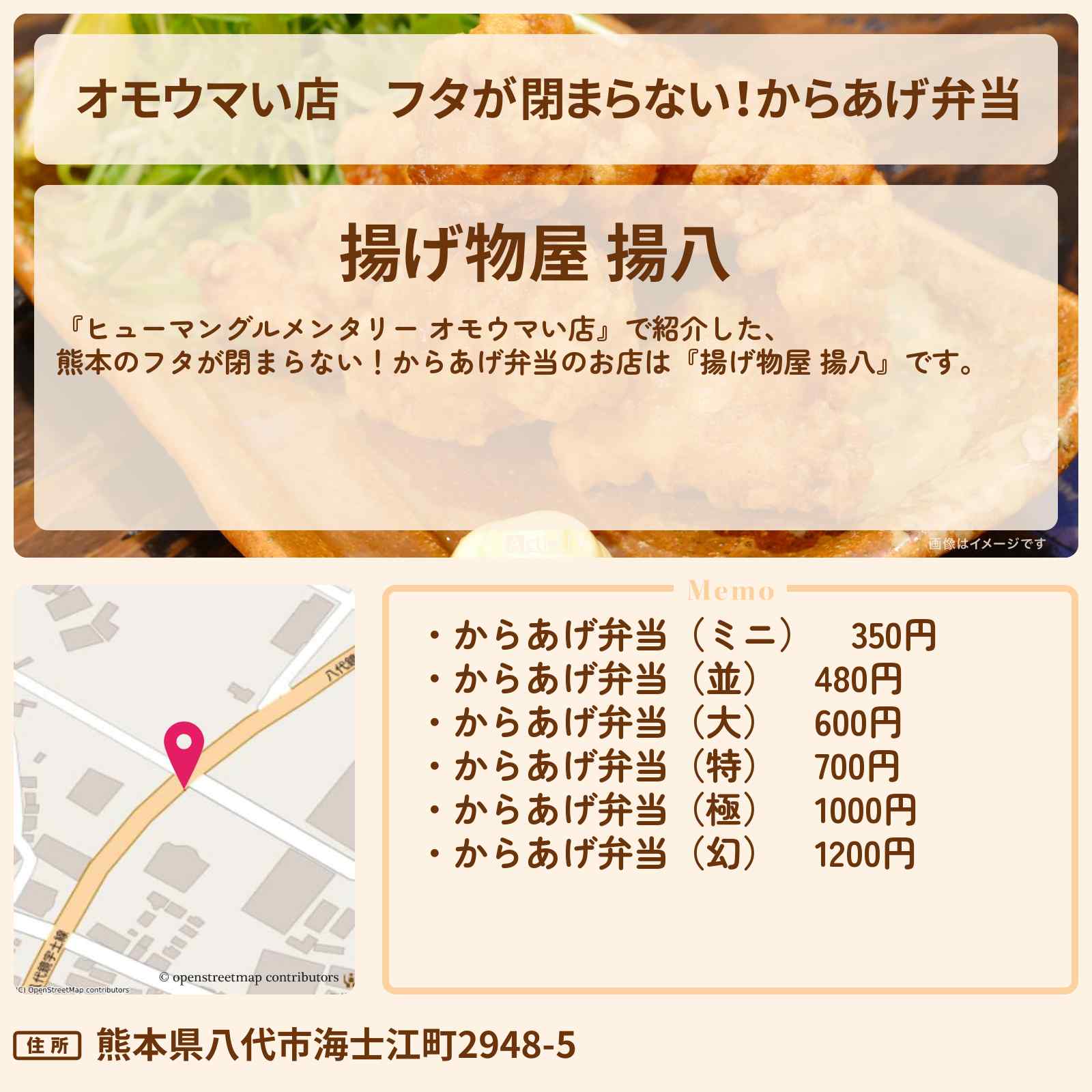 放送の【ヒューマングルメンタリー オモウマい店】で紹介した、熊本のフタが閉まらない!からあげ弁当のお店は『揚げ物屋 揚八』です。