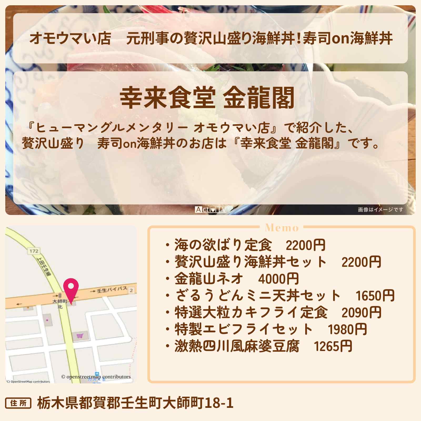 贅沢山盛り‼寿司on海鮮丼 壬生駅「幸来食堂 金龍閣」