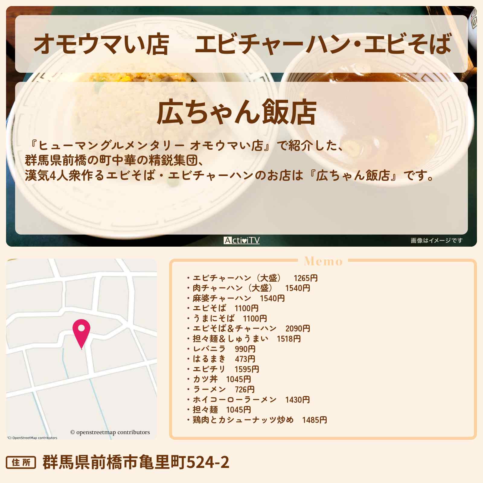 放送の【ヒューマングルメンタリー オモウマい店】で紹介した、群馬県前橋の町中華の精鋭集団、漢気4人衆作るエビそば・エビチャーハンのお店は『広ちゃん飯店』です。