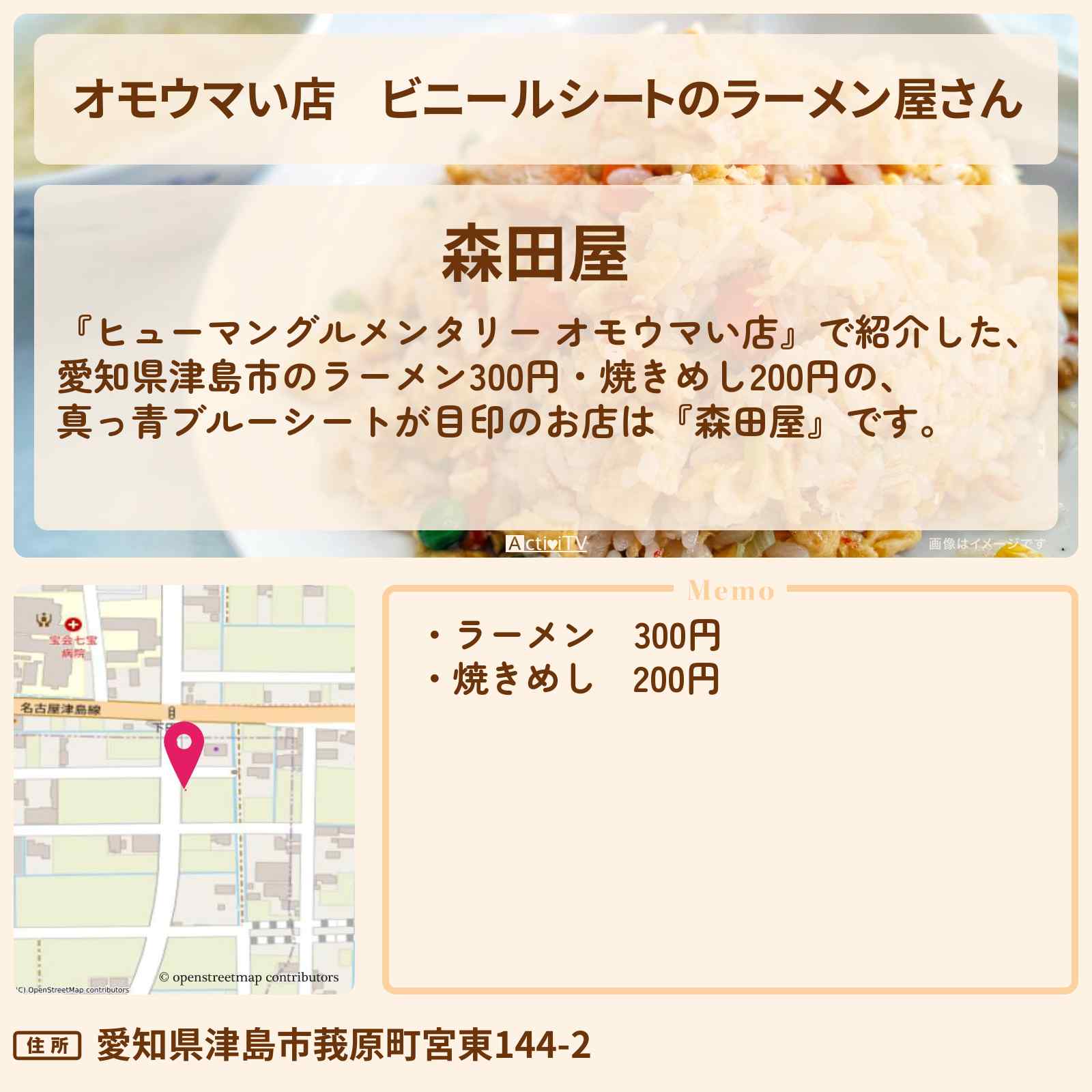 放送の【ヒューマングルメンタリー オモウマい店】で紹介した、愛知県津島市のラーメン300円・焼きめし200円の、真っ青ブルーシートが目印のお店は『森田屋』です。