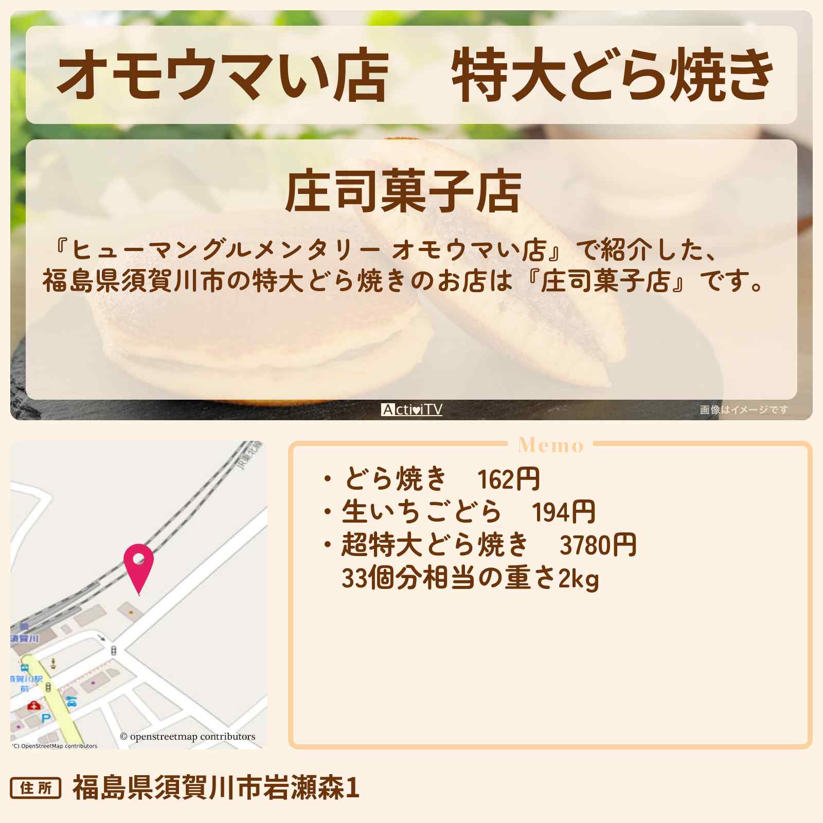 放送の【ヒューマングルメンタリー オモウマい店】で紹介した、福島県須賀川市の特大どら焼きのお店は『庄司菓子店』です。