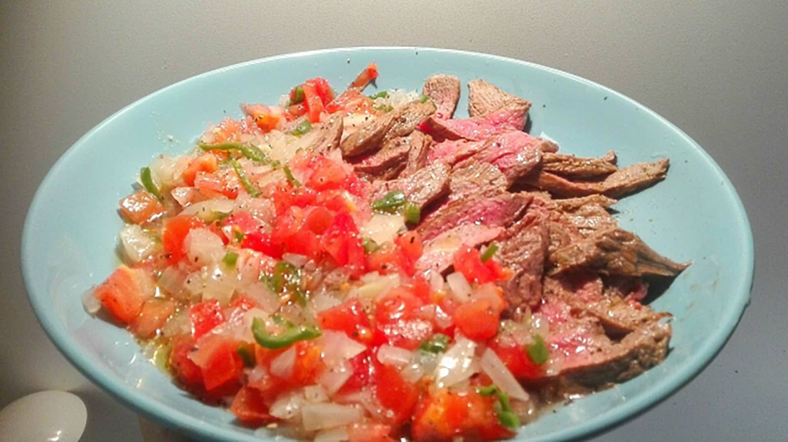 - 器に牛肉を盛りつけ、混ぜ合わせたトマトのソースをかける